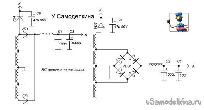 В самой ПП необходима также доработка выпрямителя, прежде всего замена выходных конденсаторов на более высоковольтные, при необходимости замена диодных сборок или сборка выпрямителей по приведенной ниже схеме, два варианта. Следует отметить, что сборки на диодах Шотки типа SB35L40PT и т.п., устанавливаемые в 5-вольтовый канал, хоть и имеют по даташиту (datasheet) допустимое напряжение 40 В, иногда прекрасно пробиваются при выпрямленном напряжении 14…16 В, в следствии чего вылетают транзисторы на высокой стороне. Выбросы в напряжении, выходящем с трансформатора, могут превышать 60 В, поэтому сборки и диоды применяем не ниже 100 - вольтовых.