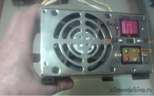 Для всех изделий наличие светодиода «220» необязательно, достаточно установить на ПП лампочку индикатор включения-нагрузка холостого хода (см. один из дальнейших рисунков), ее свечение прекрасно видно сквозь решетки. Для БПШ только она и нужна (или светодиод), а у БПУ есть светящийся вольтамперметр.