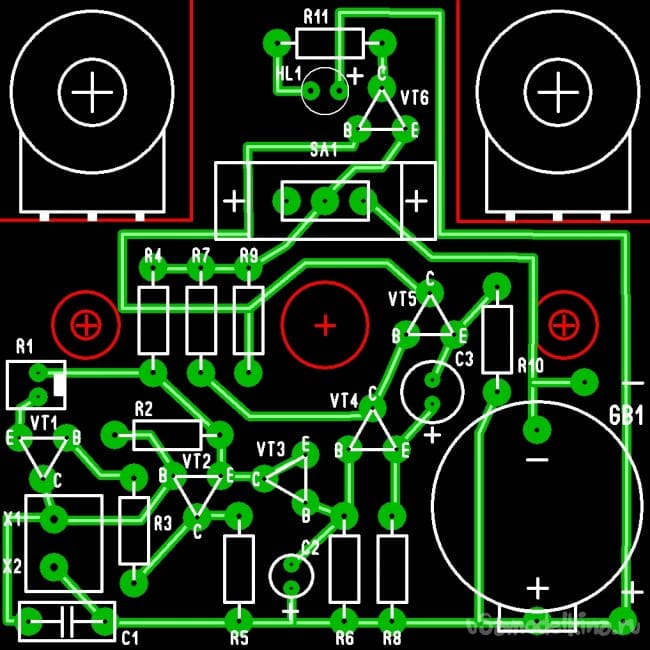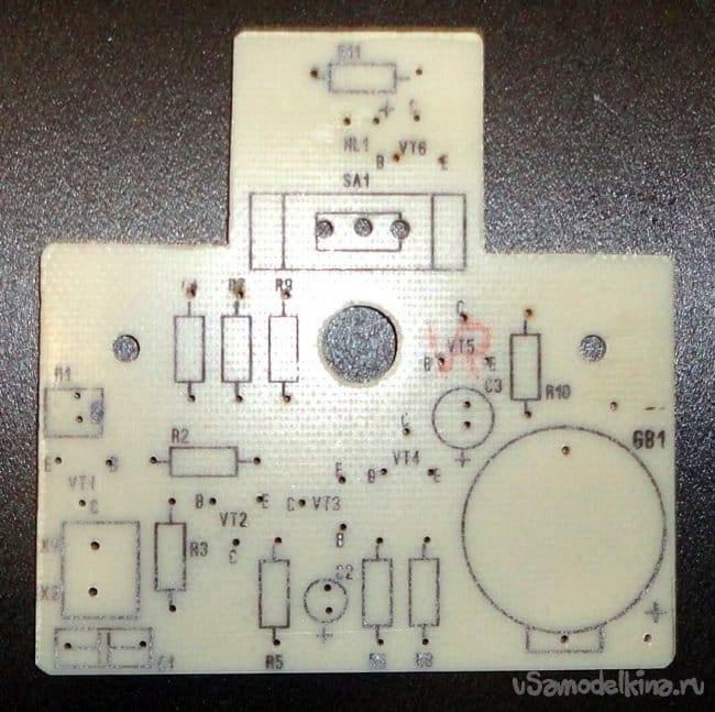 Печатная плата изготовлена под корпус соединительной коробки, из стеклотекстолита 68х68мм. Сверловка под ножки транзисторов сделана симметричной, что позволяет беспроблемно устанавливать транзисторы как в корпусах КТ-13 так и ТО-92 (КТ-26). Светодиод установлен на пластиковой опоре. Разводка платы представлена со стороны радиодеталей.
