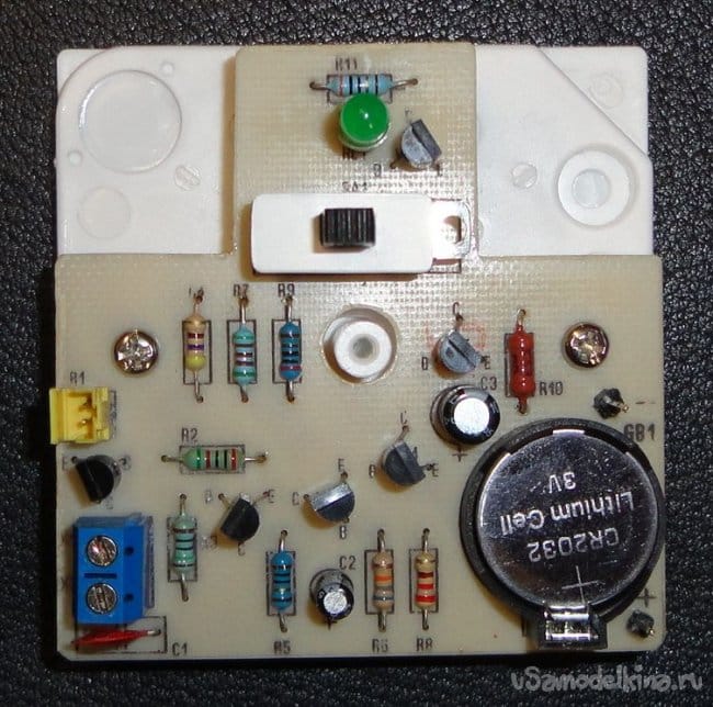 В схеме И. Паздникова некоторые детали были заменены на имевшиеся у меня в наличии. Добавлен резистор плавной подстройки. С целью экономии батареи лампочка заменена на светодиод. Для удобства проверки и настройки выведены дополнительные контакты на питание. Которые при необходимости можно вывести на разъем, для подключения сетевого адаптера (если отсутствует батарейка).