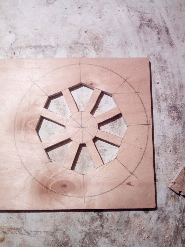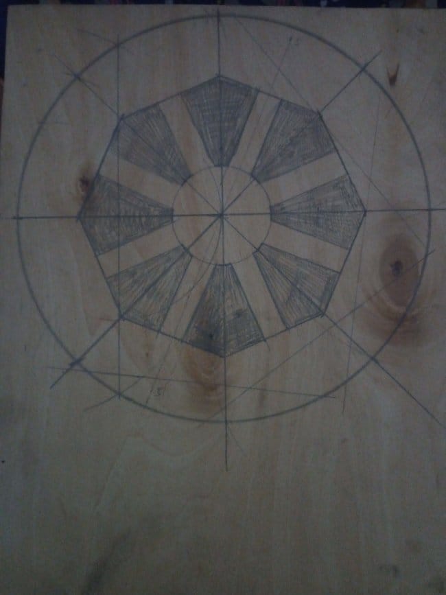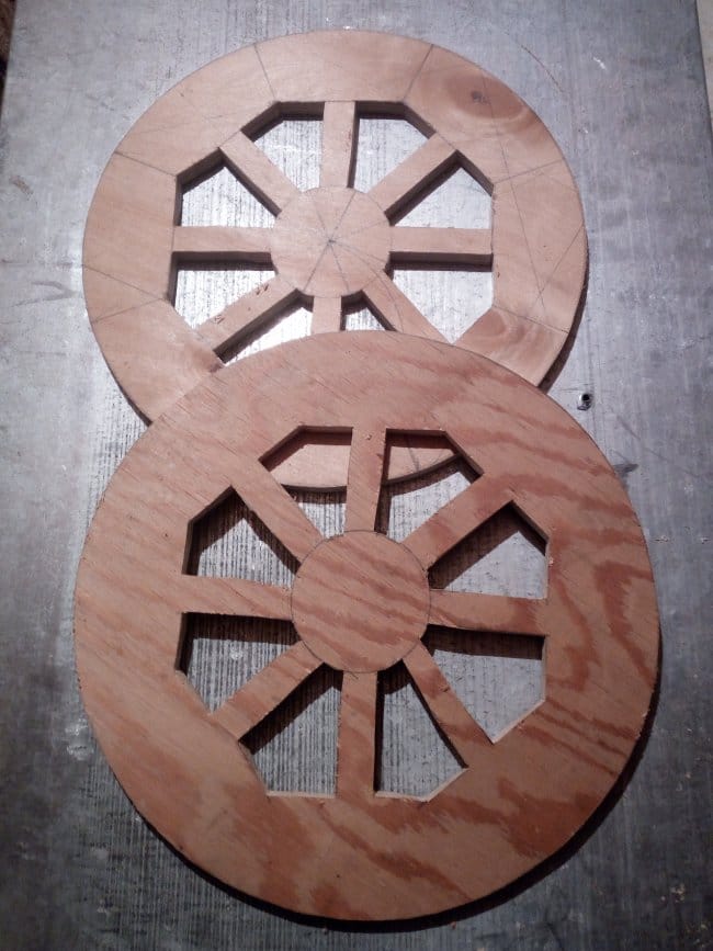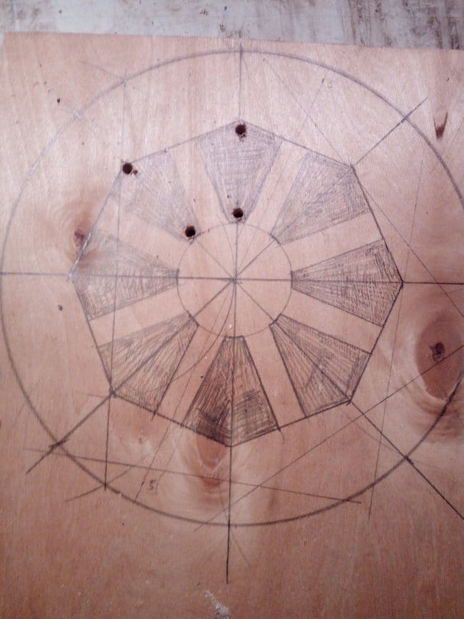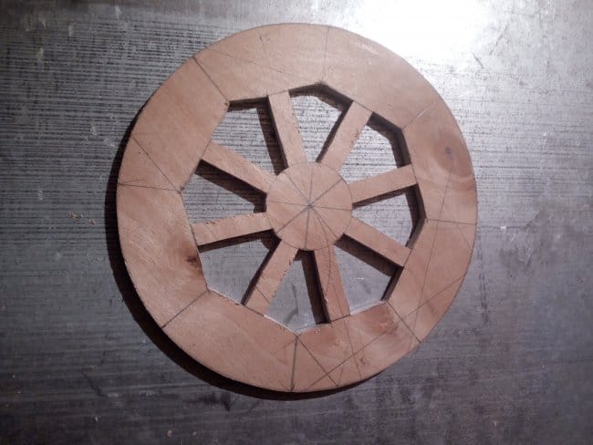 Изготовление тележки я решил начать с колес. По задумке они должны были быть сегментными, как в больших телегах в которые запрягали лошадей. Но напилив заготовки я решил что это слишком хлопотно и долго делать такие колеса для тележки, которая будет использована всего лишь один раз. Поэтому было решено изготовить колеса из фанеры в 12 мм. Циркулем нарисовал круг нужного мне диаметра. Разбил его на 8 частей, каждая из которой стала сегментом колеса. Далее на заготовке по полученному уже чертежу нарисовал колесо полностью, так, как оно должно выглядеть после выпиливания.
