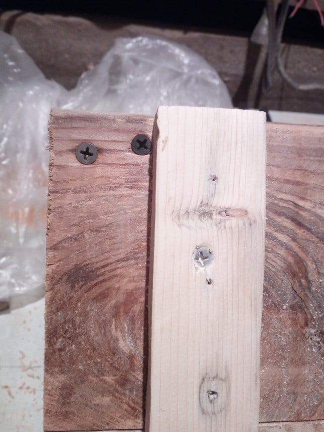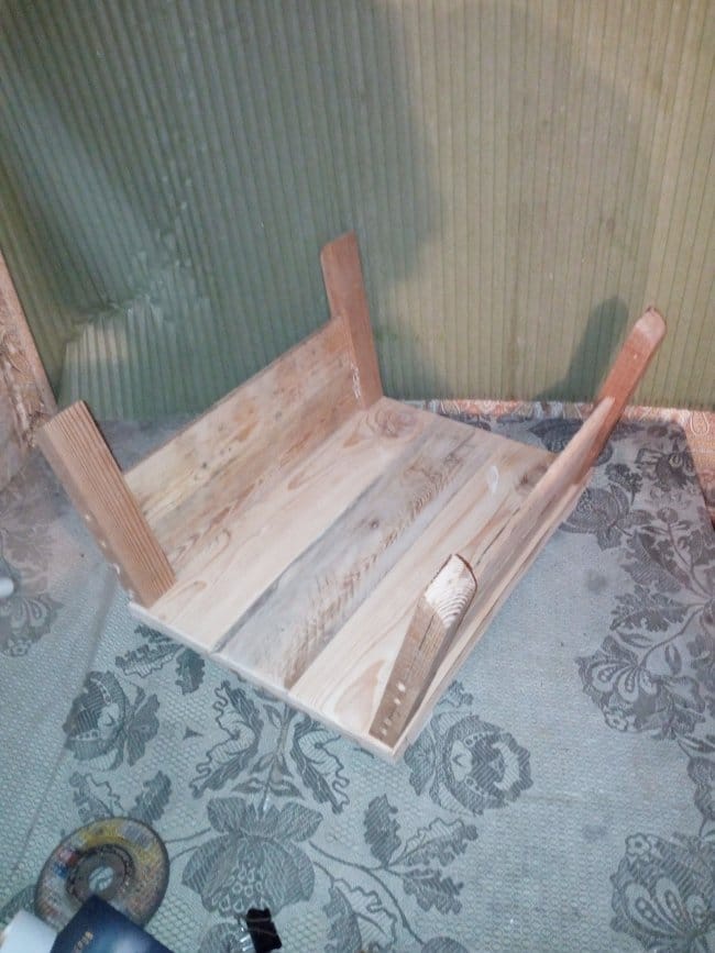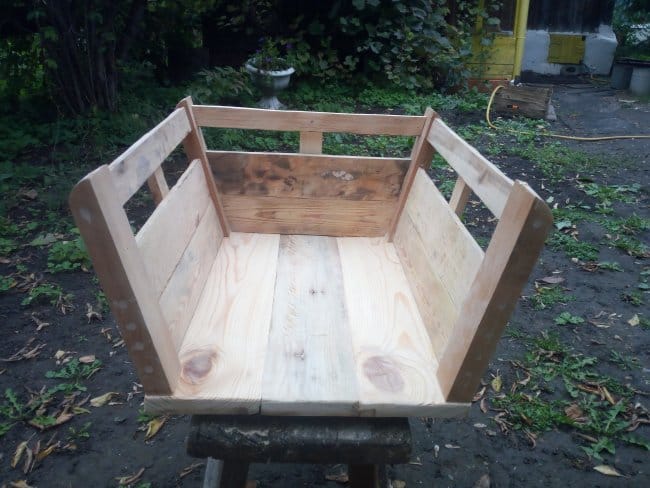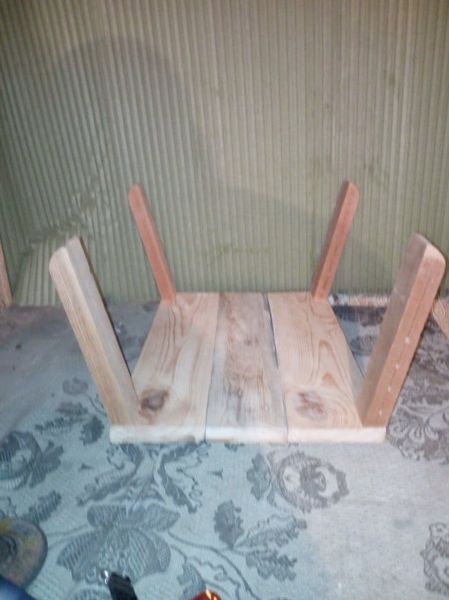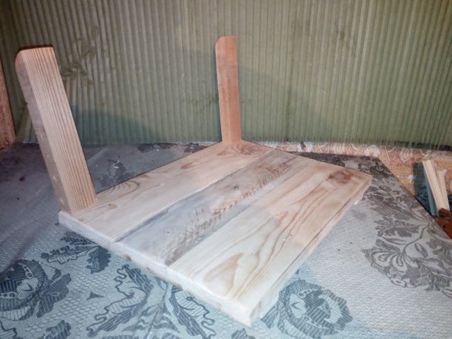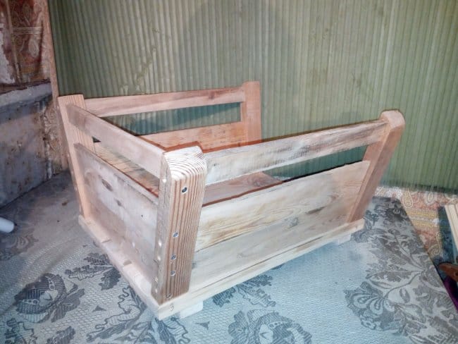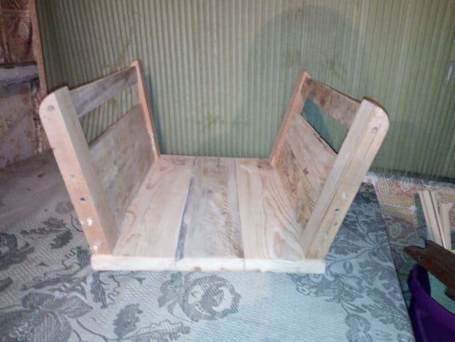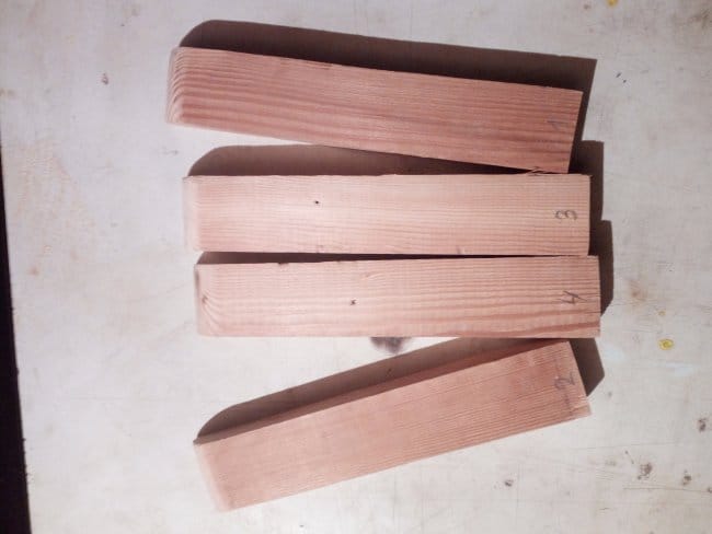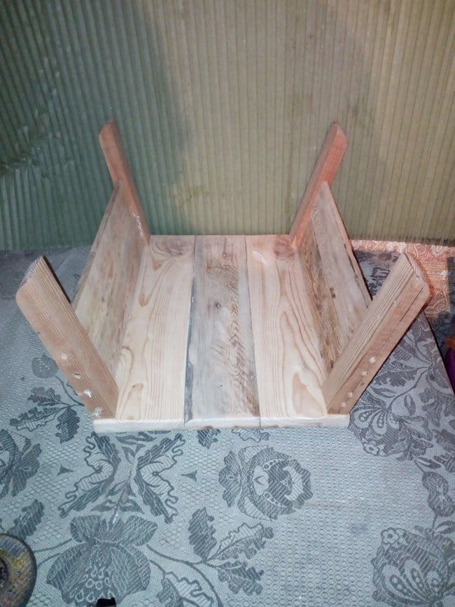 Теперь приступаю к сборке дна тележки. Для этого мне была необходима доска 20х100 мм. Разделив ее на 3 части, сложил их вместе и с внешней стороны скрепил поперечными перекладинами. Прикручивал их на саморезы. Т.к. использовал я доску которая была уже в деле, то даже после предварительной шлифовки она была с перепадами. Поэтому пришлось полностью выравнивать основание. После сборки основания-дна начал делать борта тележки. Из бруска 30х50 мм. были отпилены 4 детали нужного мне размера. На одном из концов, который должен будет крепиться к основанию, был сделан небольшой угол, чтобы бортики получились под наклоном. Так будет красивее, но немного неудобно вымерять и крепить обшивку бортов, которые были сделаны из доски 15х60 мм. Второй конец, верхний, был закруглен к внешнему краю относительно внутреннего пространства тележки. Эти основания для бортиков крепились саморезами с внутренней стороны дна. Просверлив отверстия я только после этого закрутил саморезы. Для более удобной и быстрой сборки деталей между собой я пронумеровал бруски и углы дна тележки. Вот что вышло на этом этапе работ: