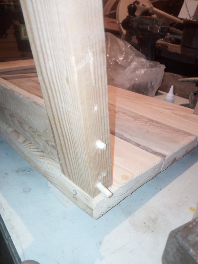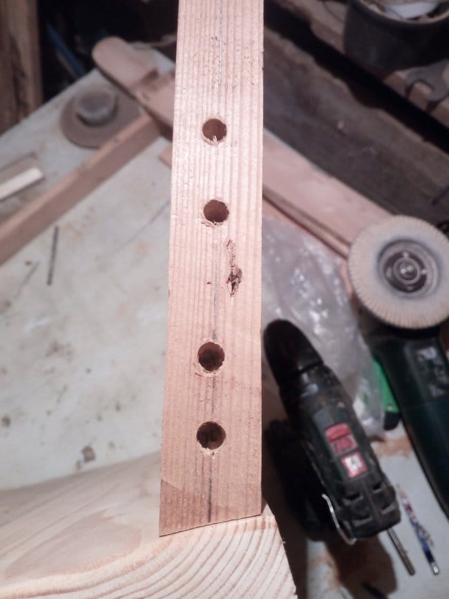 Приступил к обшивке. Борта у нас под наклоном, поэтому как можно более точно вымерял размеры и угол среза концов доски. Она должна входить в пространство между брусками достаточно плотно. Изначально хотел обшивку бортиков закрепить с помощью шкантов. И даже посадил одну доску на такое соединение. Но, даже если учесть что отверстия для шкантов заливались клеем, то все равно такое крепление не вызывало у меня доверия. Поэтому пошел проверенным и более надежным способом - креплением на саморезы. С их помощью мне удалось более плотно притянуть заготовки к брускам. Все доски закрепил не на плоскости брусков, а ровно по их середине. При крепеже высверливал отверстия и в брусках, и в торцах досок.Выглядит очень достойно. Аналогично изготовил и заднюю часть бортов. Для большей прочности прикрепил по серединам бортов дополнительные вертикальные бруски. Когда эта работа была закончена шпатлевкой по дереву заделал все отверстия в деталях.