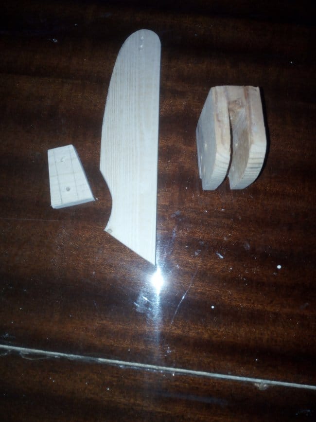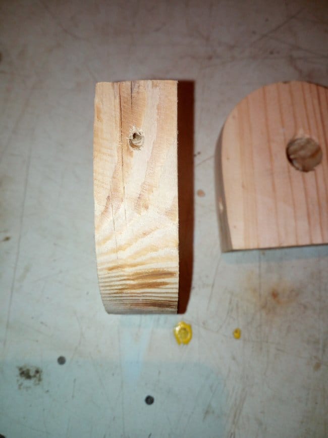 Теперь нужно закрепить колеса на тележке. Из обрезков доски изготовил такие вот детали, в середине которых просверлил отверстия, в которые будет вставлена ось для колес.