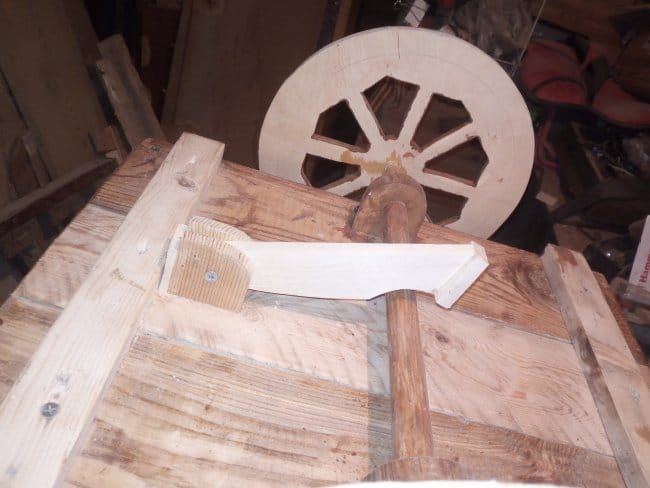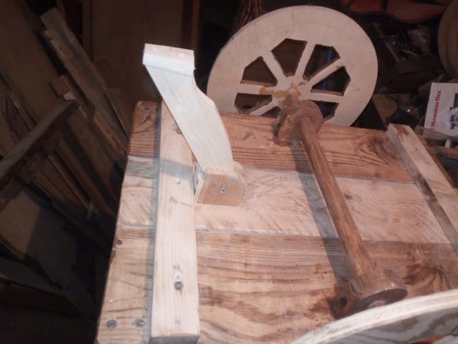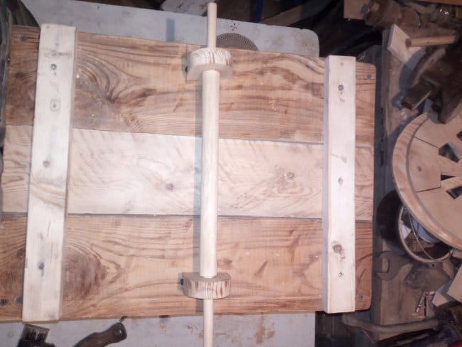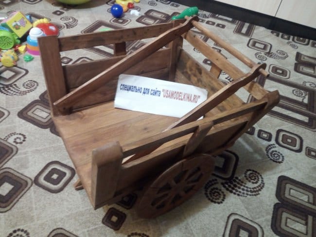 Саму ось я выстругал из бруска где-то 30х30 мм. Так как борта у телеги наклонены в стороны, то ось должна быть длиной немногим более чем ширина бортов, чтобы при установке колес они не терлись об бортики. Закрепил держатели оси на телеге саморезами. Т.к. сама ось не одной толщины, то встав в распор очень хорошо в нем держалась, не съезжая в стороны. Колеса закрепил с помощью эпоксидной смолы, побоялся расщепить тонкую часть оси. Тут я конечно, немного поторопился. Колеса нужно было крепить в последнюю очередь, чтобы дальнейшие манипуляции проводить без помех.