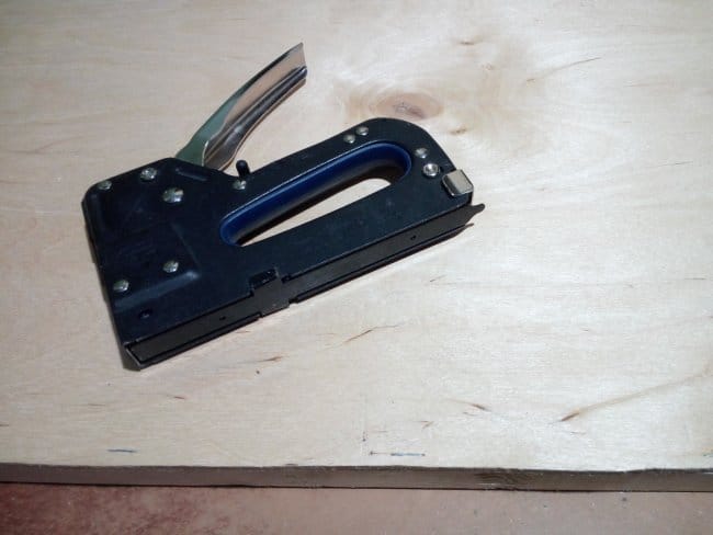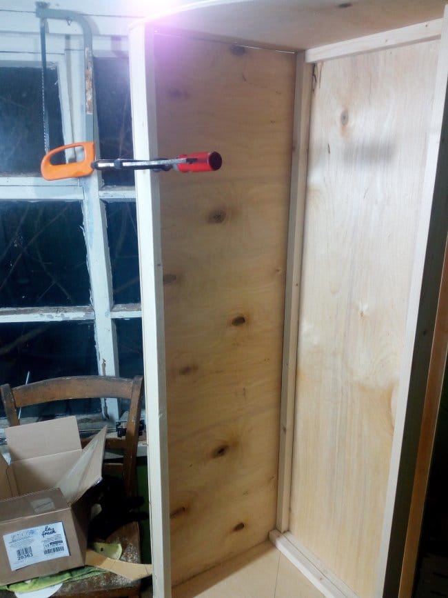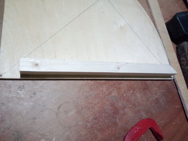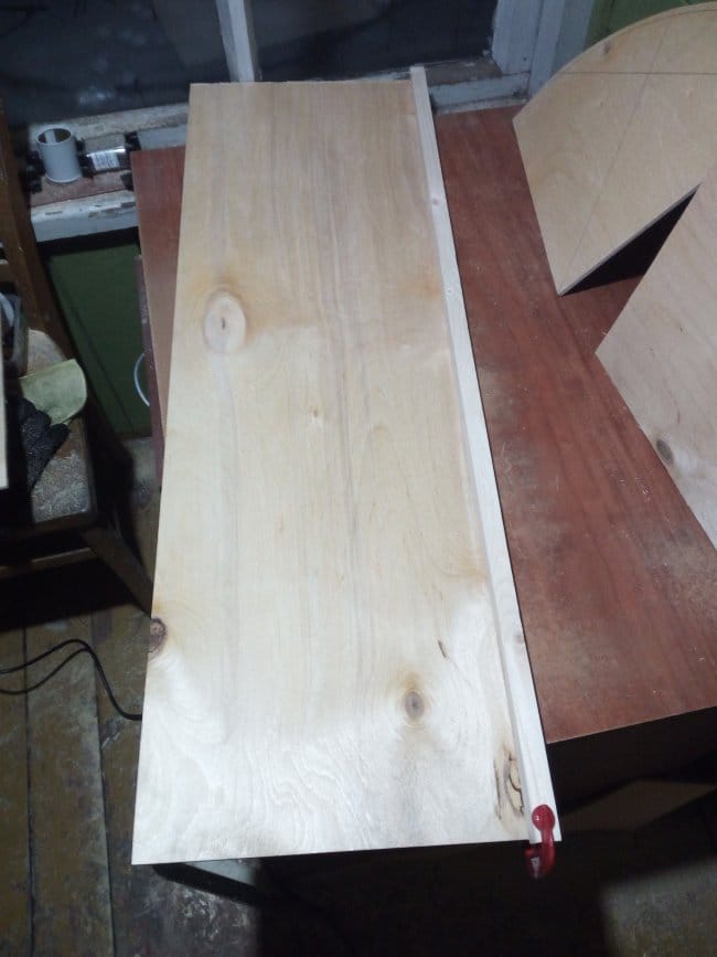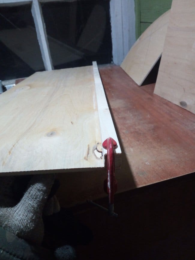 Теперь, когда основные детали полки заготовлены, перехожу непосредственно к сборке изделия. Прикладываю брусок к одной из сторон боковой стенки и плотно его фиксирую струбцинами. Для крепления фанеры к бруску, который играет здесь роль ребра жесткости и к которому будут крепится обе части стенок (т.к. фанера тонкая поэтому он и нужен) изначально использовал строительный степлер, но как оказалось на практике, скобы не очень хорошо прижимают заготовки друг к другу, а следовательно конструкция получается очень хлипкой. Поэтому все дальнейшие соединения будут выполнены саморезами