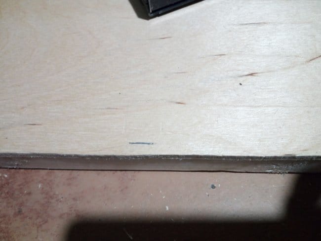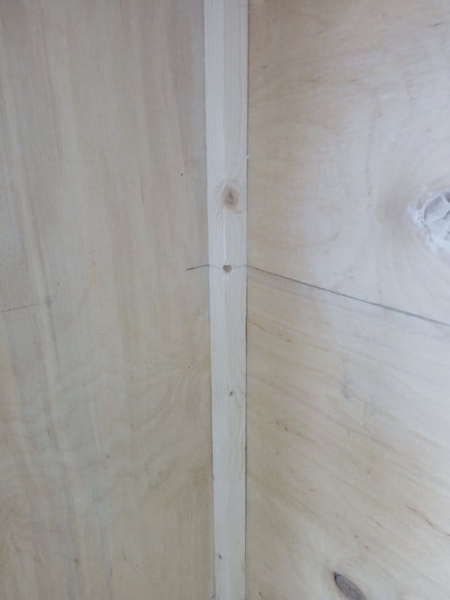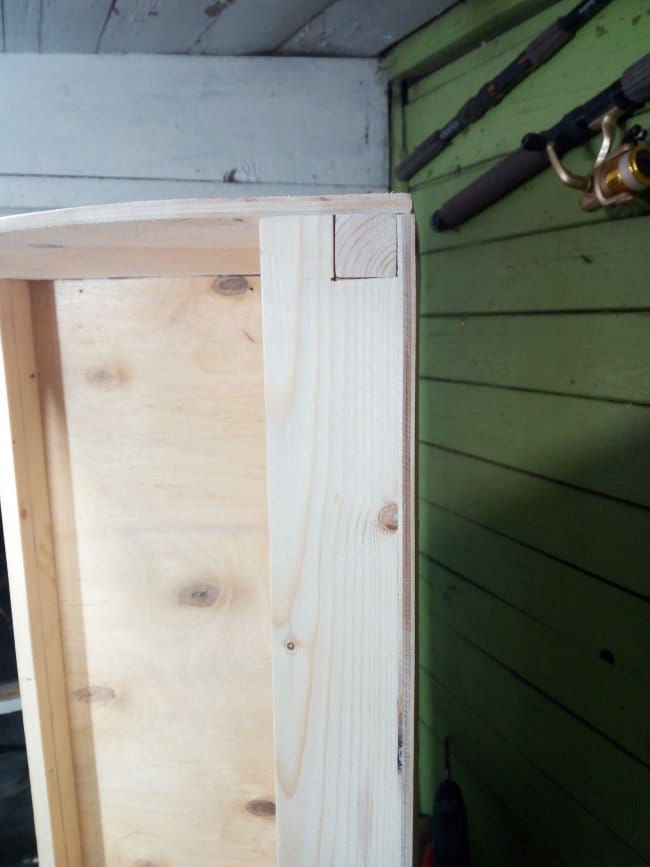 Следующий шаг - это крепление верхней и нижней крышек к стенкам полки. Тут так же используется брусок, на который будут крепится крышки. Сами бруски крепятся к крышкам с таким расчетом, чтобы все фанерные части не выступали, т.е. были "заподлицо". Для этого отступаем от края 4 мм и прикручиваем опорные бруски.