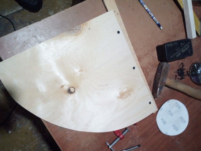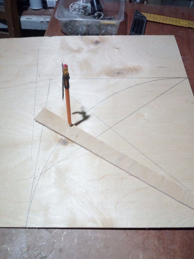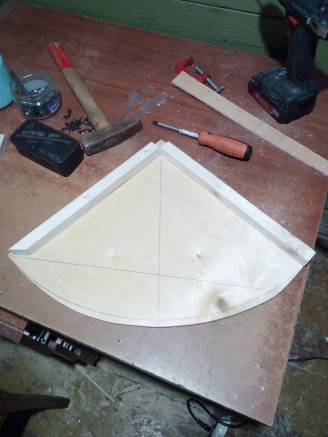 Итак, начнем подготовительный этап, а именно заготовку деталей. Первым делом я отрезал от листа фанеры две одинаковые части нужного мне размера. В данном случае размер я указывать не буду, т.к. это не принципиально. Каждый решившийся сделать такую полку самостоятельно определит размеры под свои нужды. Это у меня будут боковые стенки. Далее отрезается брусок, равный по размеру высоте боковых стенок. Такая деталь нужно в единичном экземпляре. От рейки отпиливаются уже 2 таких части, на каждую из сторон боковин. После этого подготавливаются две крышки - верхняя и нижняя. Я их решил сделать закругленными. Для этого в обрезок фанеры я закрутил с одной стороны саморез, а в другой высверлил отверстие под карандаш. С помощью такого нехитрого приспособления отметил границу распила.