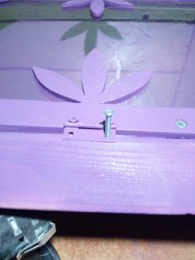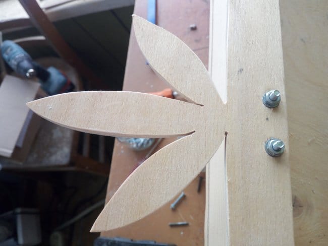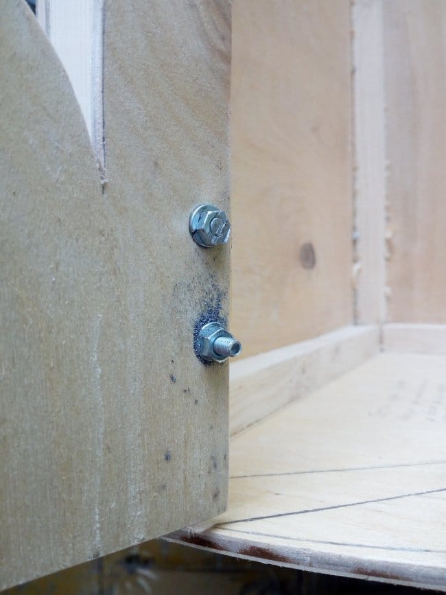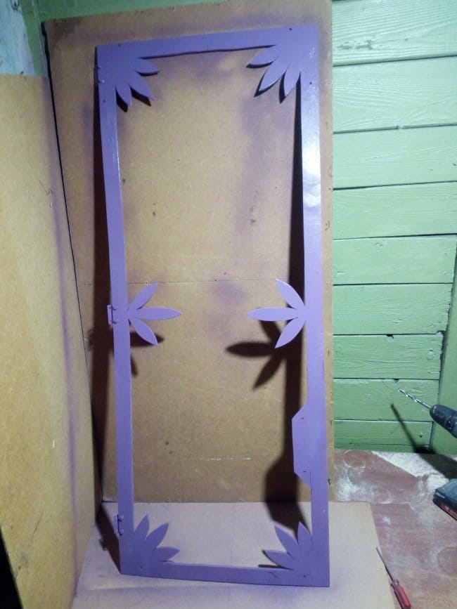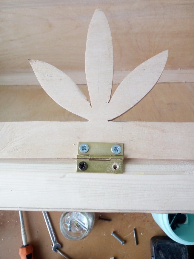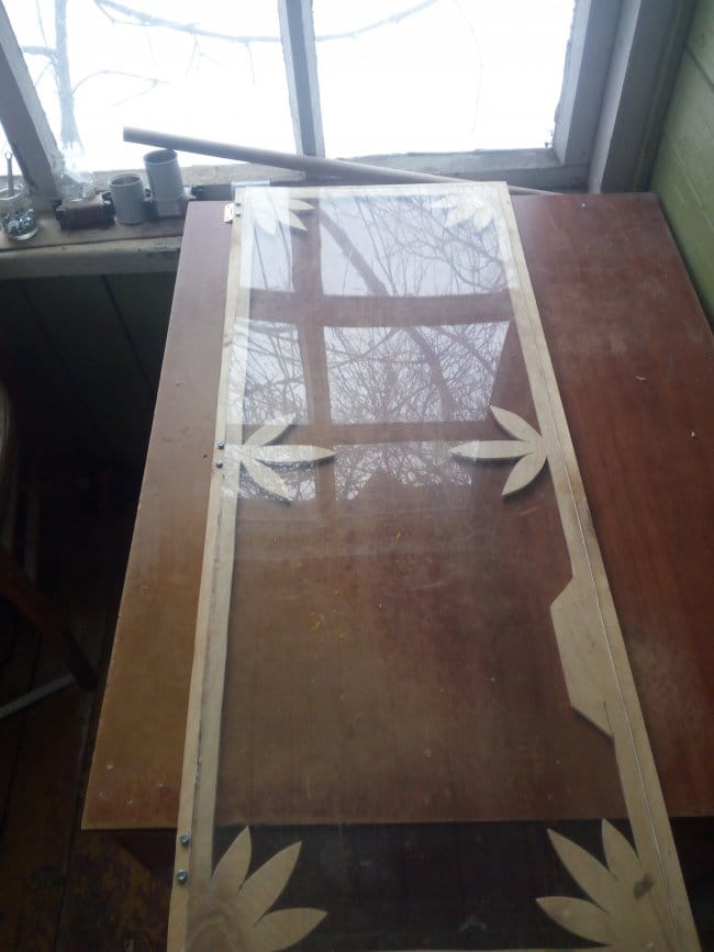 Следующий шаг это дверка. Берется кусок фанеры равный по ширине проему между двумя рейками. На него я наношу рисунок и лобзиком выпиливаю все ненужное. Не забываю и про место под ручку двери. После этого начинаю подгонять дверь к полке. Петли к двери я закрепил болтовым соединением, так как фанера тонкая и на тот момент я ничего более подходящего в своем арсенале просто не нашел. Хотя можно было сделать крепежи и с помощью вытяжных заклепок, получилось бы более аккуратнее. Выступающие части болтов опиливаю и зашлифовываю наждачной бумагой. За одно примеряю кусок оргстекла, которое будет на двери.