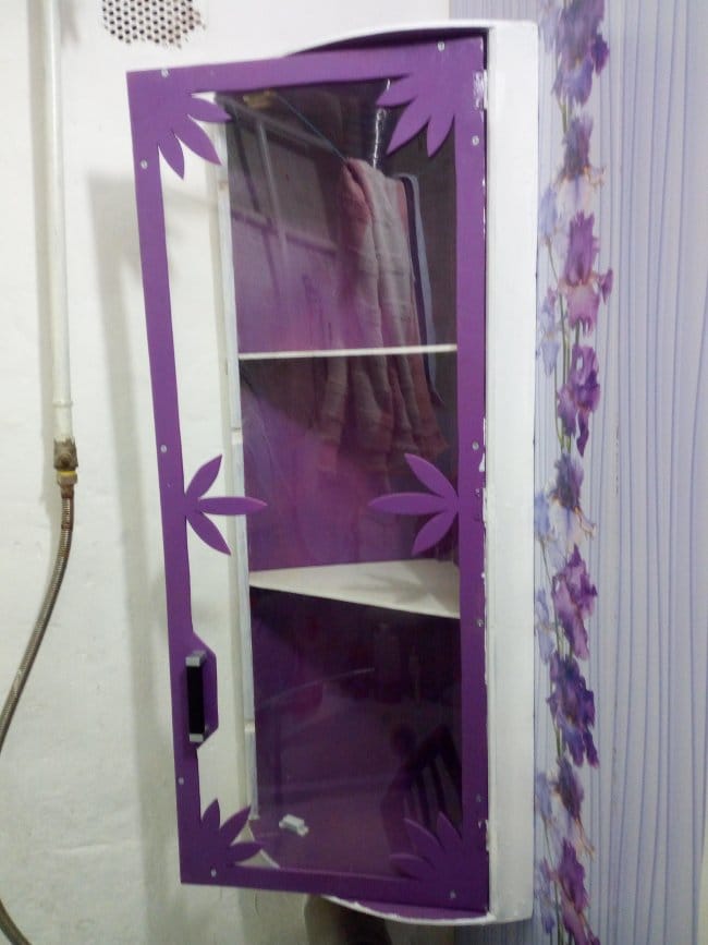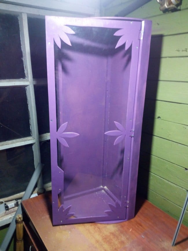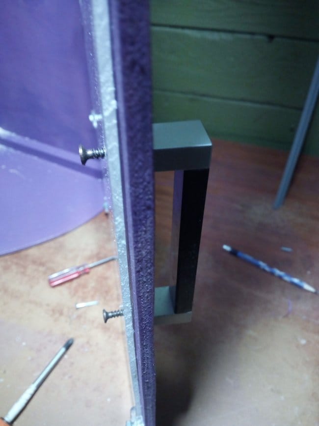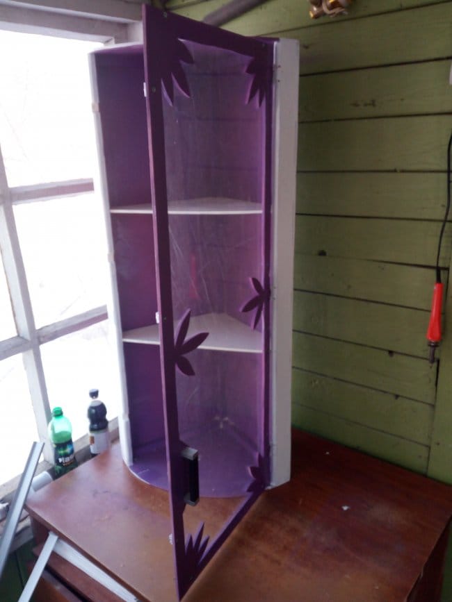Все деревянные поверхности шлифуются и готовятся под покраску. Так как я красил без предварительной грунтовки деревянных частей, то краски у меня ушло много. Она просто напросто впитывалась в древесину как вода в губку! После окрашивания и полного высыхания собираю все воедино: закрепляю дверку, оргстекло и ставлю ручку.