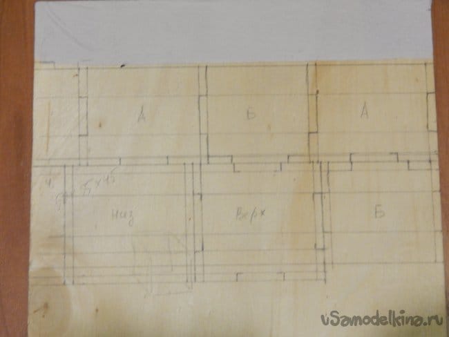 С определением габаритов корпуса опять же начал «танцевать» от трансформатора, точнее с изготовления коробки, в которой он будет размещён. На листе фанеры расчерчиваем детали.