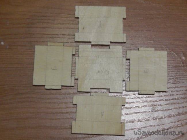 На трёх внутренних деталях выпиливаем «курок» и полости под выключатели, две наружных будут просто крышками. На фото плохо видно, но могу сказать, что направление волокон фанеры на деталях чередуются как и положено в многослойной фанере.