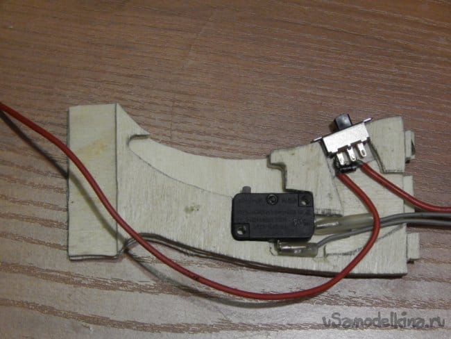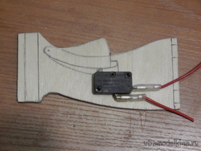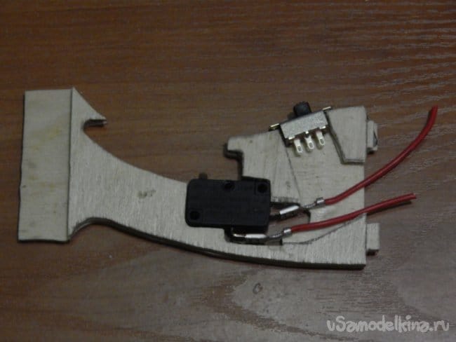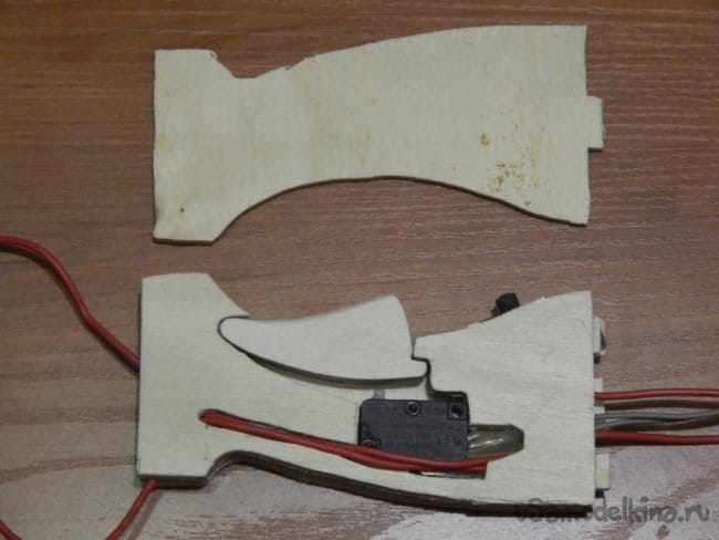 Сначала надо определиться с местом установки выключателя, я использовал эту деталь от старой микроволновки. Отталкиваясь от местоположения выключателя определяем размер и рабочий ход «курка» (ну не хочу я эту деталь по другому называть)