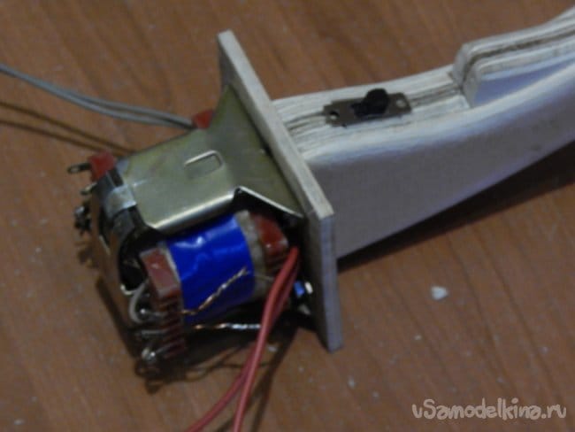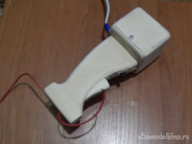 Скрепив синей изолентой до высыхания клея. Деталь, на которую в последствии будет крепиться трансформатор и рукоятка, и будет отправной точкой нашей конструкции.