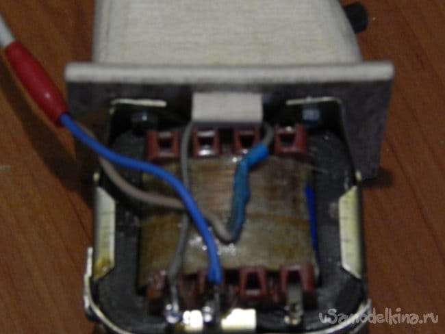 Для нагрева нихромовой проволоки длиной 125мм и диаметром 0,3- 0,5мм (сопротивление 0,7- 2 Ом) посчитал достаточным напряжение вторички около 3В и ток порядка 5А (повторяю- все расчёты приблизительные, сопротивление нихрома при нагреве увеличивается). В наличии имелся трансформатор с броневым сердечником с площадью поперечного сечения 6 см, что соответствует габаритной мощности 30 Вт, чего вполне достаточно. С перемоткой особо не мудрил, сосчитать количество витков на вольт не удалось- наружные витки были пропитаны лаком, пришлось вторичку просто срезать и мотать новую «от балды» проводом ø 1,5 мм в «две нитки». Такой способ намотки предполагал ступенчатую регулировку мощности, но я переборщил с количеством витков, по этому пришлось просто соединить обмотки параллельно.