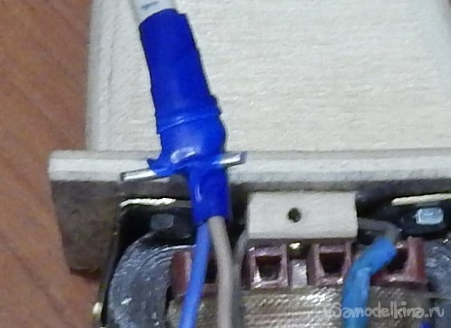 Чтобы шнур питания не выпадал из корпуса приматываем к нему синей изолентой стопор- выгнутые из алюминиевой проволоки «усики».