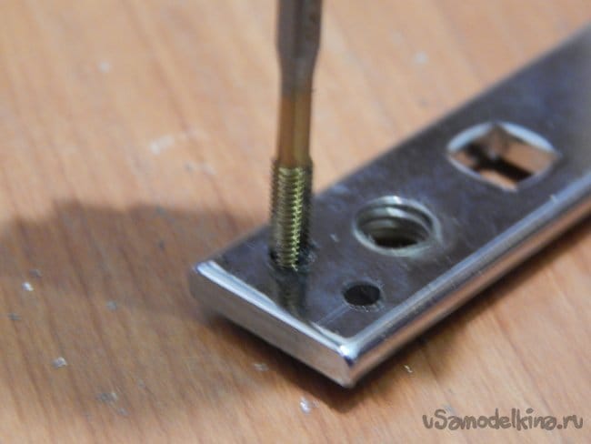Затем нарезаем резьбу М3 для крепления изоляционной пластины (как в дальнейшем оказалось достаточно было это сделать только на одном конце скобы).