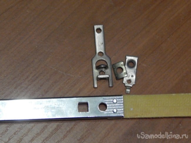 Так как скоба лобзика будет использоваться в качестве проводника, то верхний конец изолировать совсем не обязательно. Верхнюю изоляционную пластину я хотел поставить для симметричности крепления, но затем посчитал это излишним и использовал деталь электросчётчика, которая при небольшой доработке очень хорошо подошла.