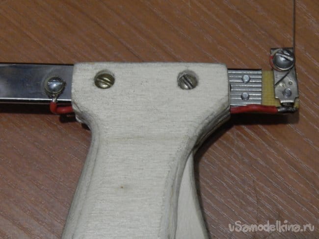 Рабочий элемент- нихромовую проволоку устанавливаем точно так же, как пилку для лобзика, с тем лишь отличием, что зажимаем её между двух шайб, сделав один оборот вокруг винта. Обязательно делаем небольшую натяжку проволоки, так как нихром при нагревании довольно сильно удлиняется. Нихром был использован от спирали, применяемой в бытовых приборах.