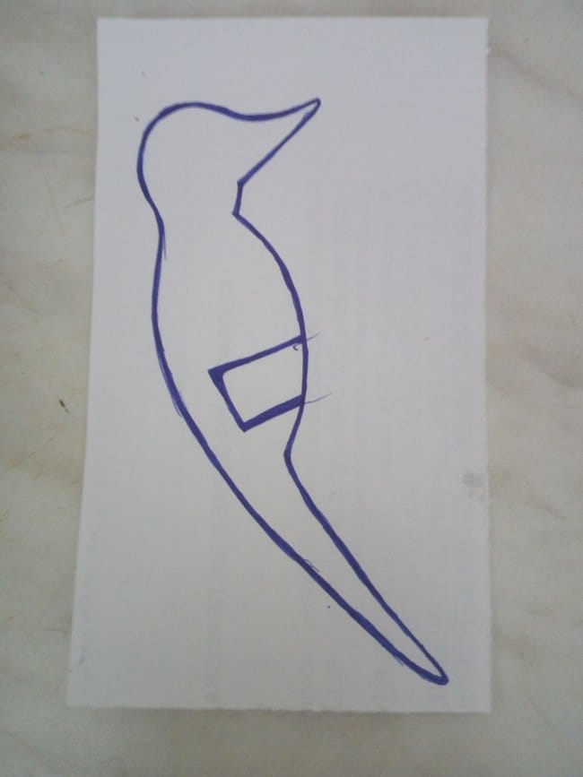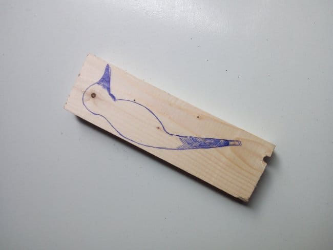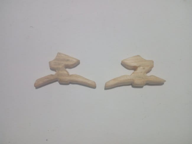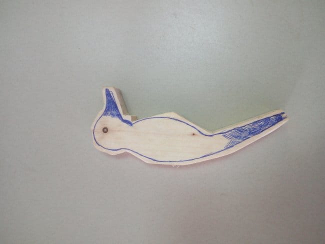 В самом начале работ я нарисовал эскиз птицы на бумаге. Вырезал его и обвел по контуру на деревянной заготовке, коей послужила 15-ти см. сосновая планка. Далее обломком полотна по металлу отпилил все лишнее, стараясь чтобы пропил проходил как можно ближе к контуру рисунка. После этого, канцелярским ножом придал более аккуратный вид фигурке. Наждачной бумагой зашлифовал некоторые неровности. Нарисовал ручкой более приемлемую форму клюва. Резцом вывел все линии на головке. Таким же способом вырезал крылья для игрушки. Но перед этим на деревяшке что послужит основой для крыльев я обрисовал среднюю часть готовой заготовки. Уже на ней изобразил крылья, чтобы увидеть как это будет выглядеть. Расщепил заготовку на несколько более тонких частей в вырезал крылья