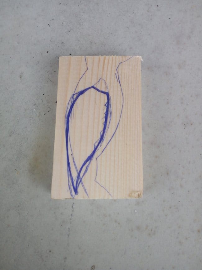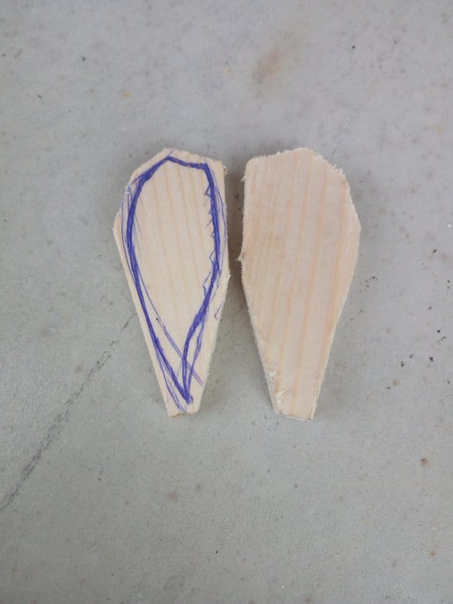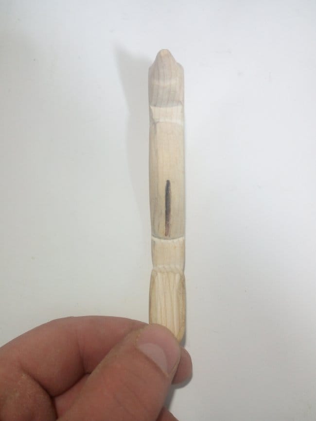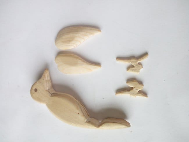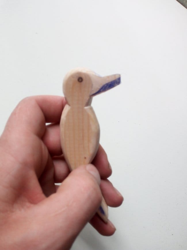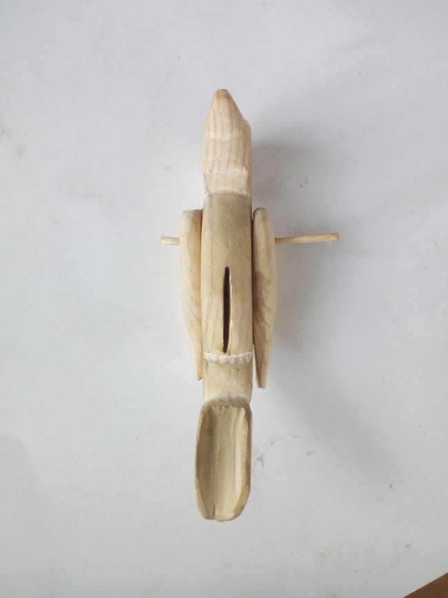 Со стороны живота нарисовал и вырезал канавку, в которую будет вставлена планка. Она будет служить опорным и двигательным механизмом всей игрушки. Канавка в моем случае не превышает толщины обычной спички, что и показано на фото. Изготовил две лапки. Все готовые изделия тщательно обработал наждачкой, от неровностей и разнообразных заусенец что появлялись в процессе резки.