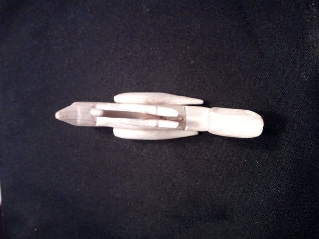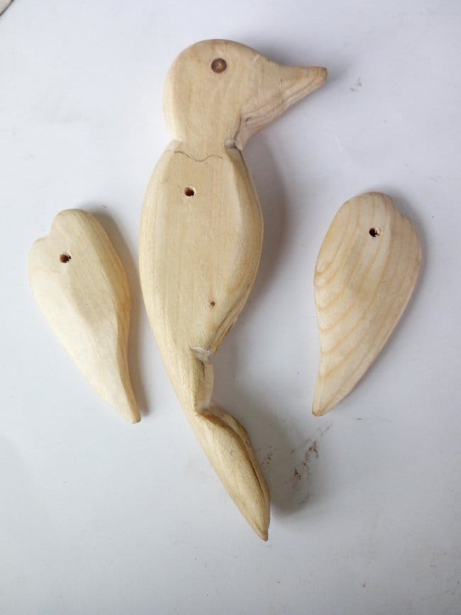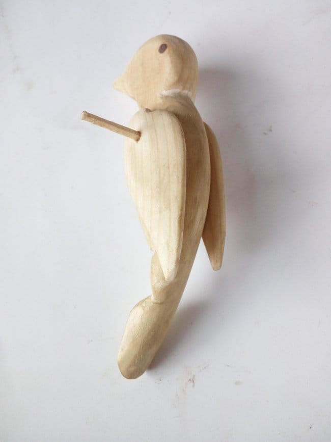 Приступаю к сборке деталей птицы в единое целое. Приложив крылья к телу фигурки, посмотрев как они будут располагаться на ней, проделал отверстия в них и в теле основы. Собирать решал с помощью шкантов. Вставил тонкий пруток в отверстия на теле птицы (оно сквозное) и на него насадил крылья. Все проклеил супер-клеем. Обрезал выступающие концы прутка и зашлифовал.