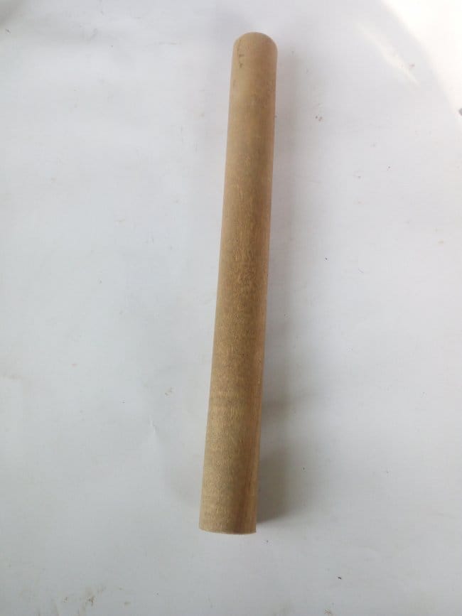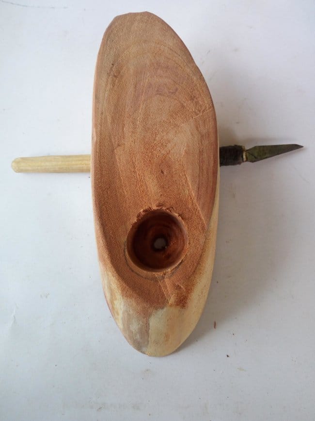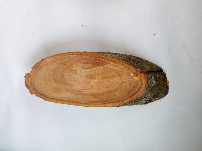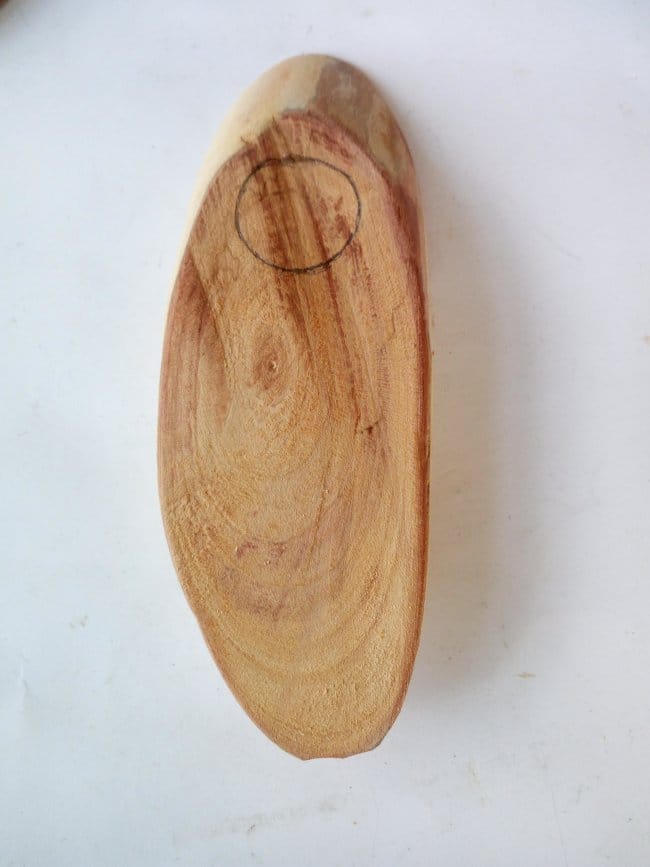 На подставку всей композиции пустил небольшую ветку от сливы, которую отпилил по диагонали для большей площади соприкосновения с поверхностью. Очистив ее от коры, я не стал верхнюю часть спила подвергать ни какой обработке, то есть не шлифовал. Решил что так она будет более похожа на землю, на которой будет стоять ствол. Отметил на нем место для установки ствола и сверлом на 22 сделал отверстие.