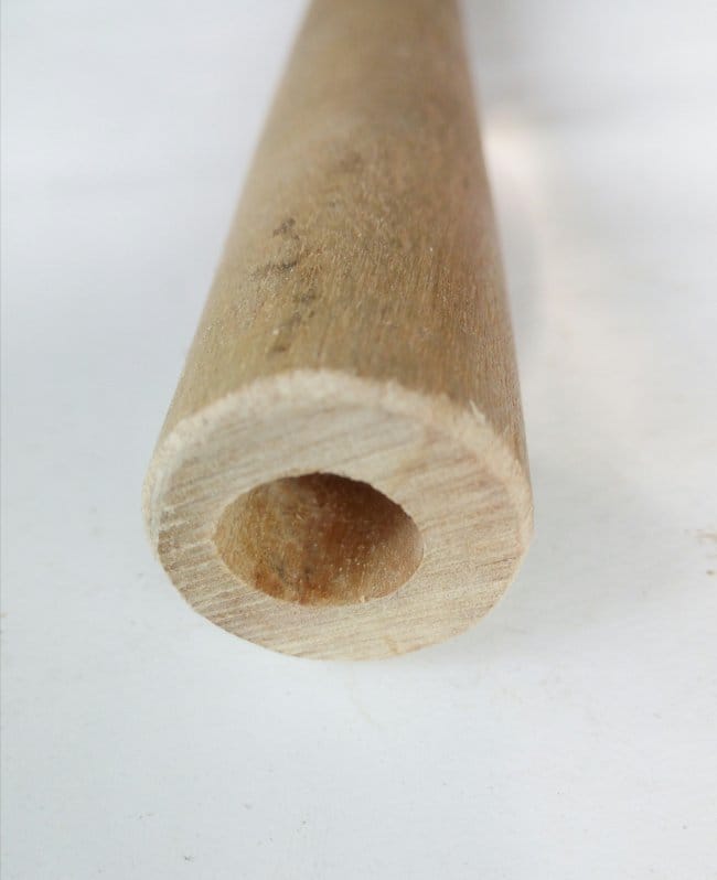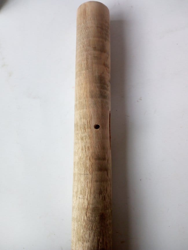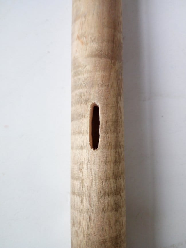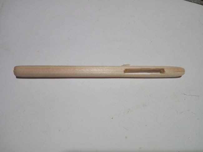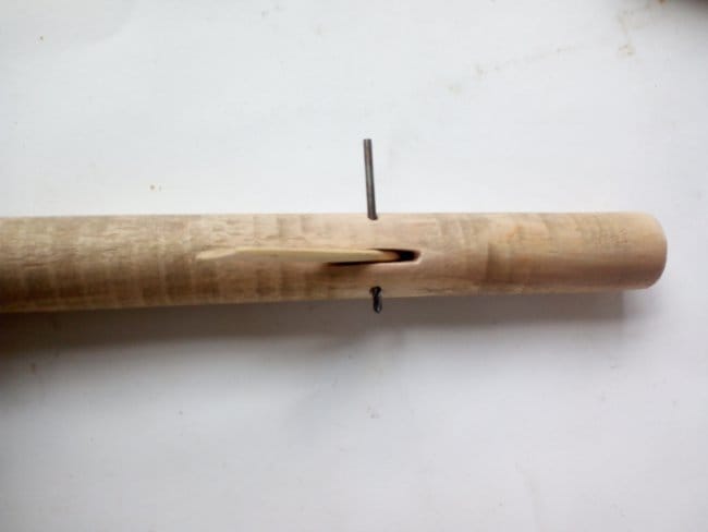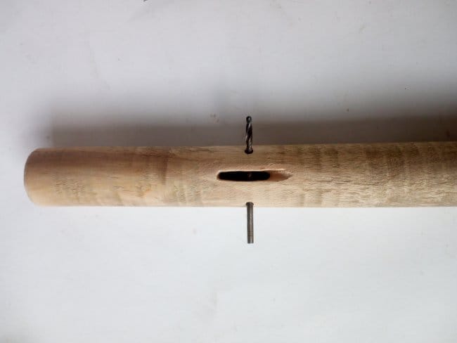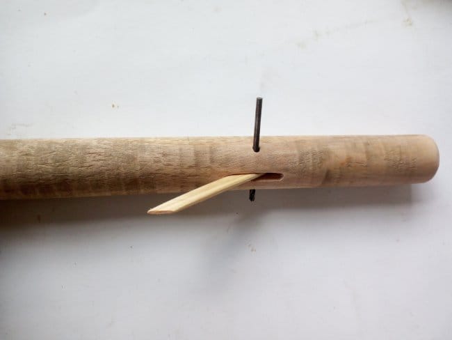Стволом дерева, на котором будет сидеть дятел, стал черенок то ли от граблей, то ли от швабры. Отпилив все тем же полотном кусок необходимого мне размера, я внутри него высверлил отверстие диаметром 10 мм. Затем выбрал в нем сквозную канавку таким образом, чтобы только одна стенка была разрезана. Вторая остается целой. По бокам канавки высверлил отверстие в 3 мм, но уже так, чтобы оно проходило через две боковины. После делаю планку основу, к которой будет фиксироваться вся птица. Т.к. фигурка должна будет совершать движение вверх-вниз, то ее нужно так закрепить на планке, чтобы она точно концом клюва стучала в ствол дерева, а на возвратном движении упиралась на хвостик. Для этого ту часть планки, что будет крепиться к самой птице, я сделал под углом, добившись того, чтобы ее движения были более правильными. В противоположной стороне сделал отверстие для шпильки. Сама шпилька будет из части гвоздя.
