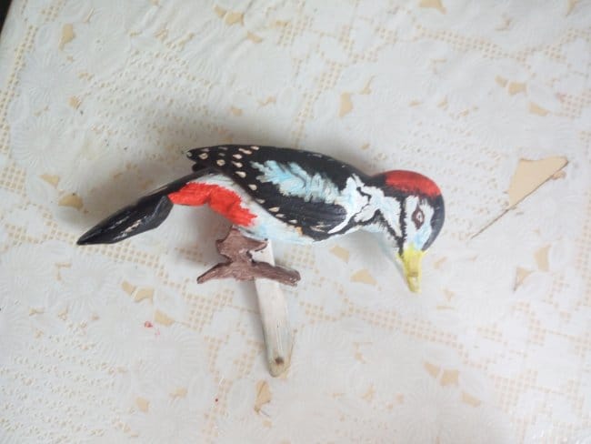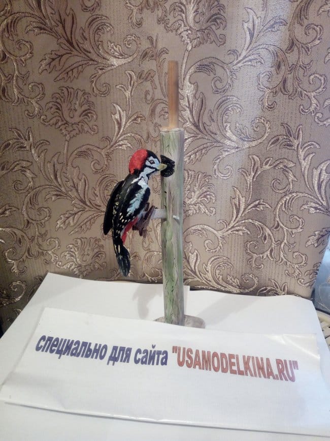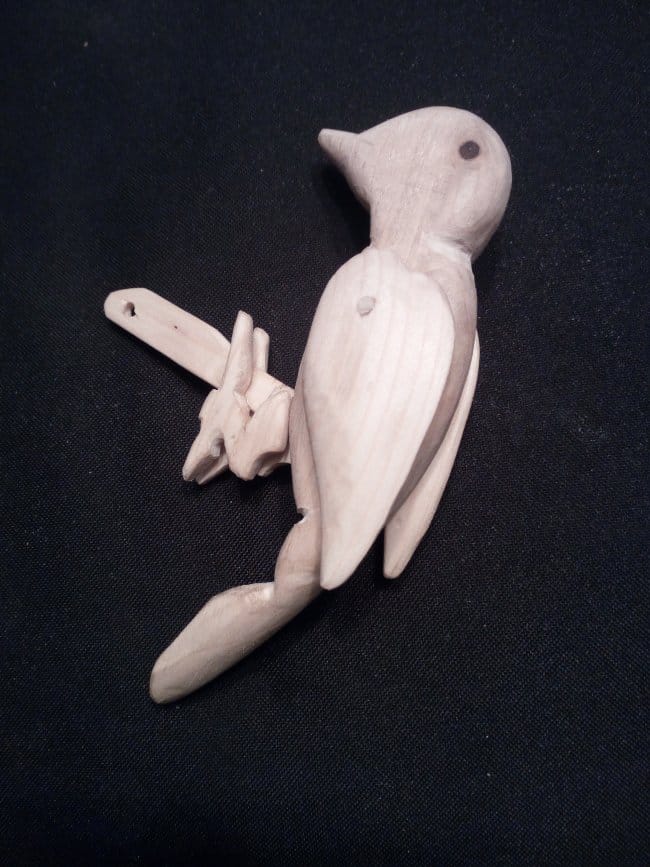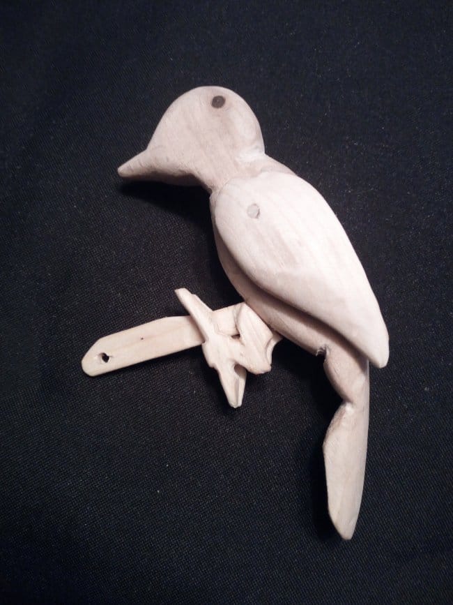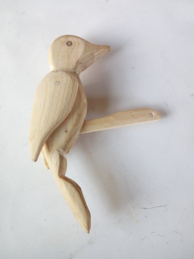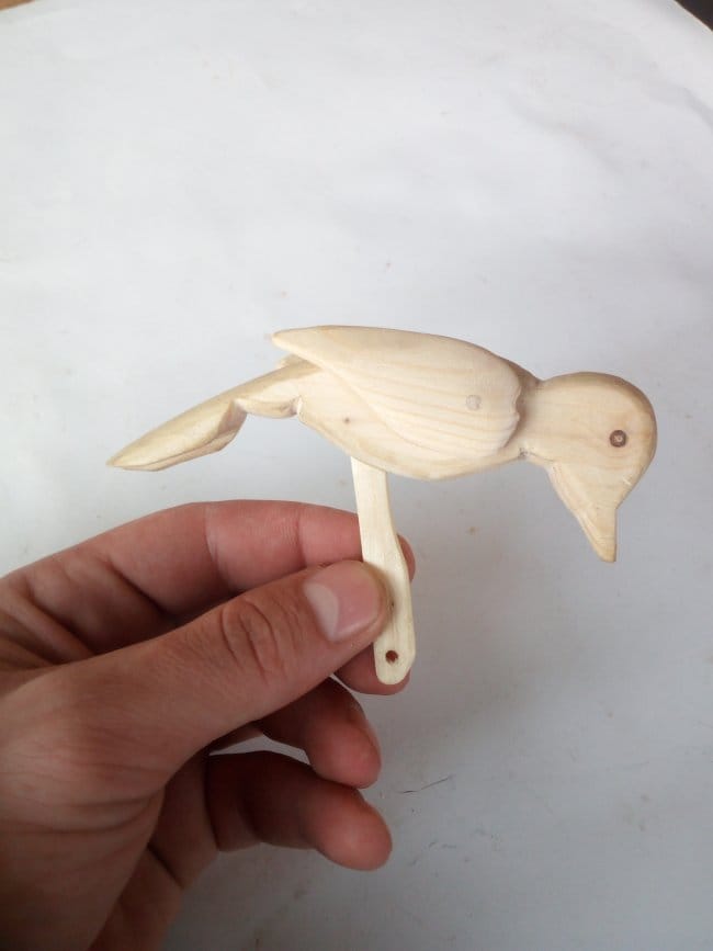 Собираю оставшиеся части. Вклеиваю планку в тело птица и на нее же клею ножки. Щель, которая осталась после того как вклеил планку, очень плотно забил опилками и капнул пару капель клея. Немного подождал пока все это намертво схватится и прошелся наждачной шкуркой. Ствол крепится к "земле" с помощью самореза с нижней части. Так же сделал ручку, с помощью которой птица и будет приводиться в движение. Она вставляется в отверстие, которое расположено в верхней части ствола и упирается в часть планки которая находится в стволе. При нажимании ручки, она упирается в планку и толкает дятла вверх. В исходное положение, т.е. тогда когда она упирается хвостом в ствол, птица возвращается сама под воздействием своего веса. Конечно в начала этого не происходило, части игрушки были еще не притерты и возвращать ее приходилось так же вручную. Зато через некоторое время игр и энных количеств подъемов-опусканий, детали "обкатались" и игрушка стала работать как нужно!