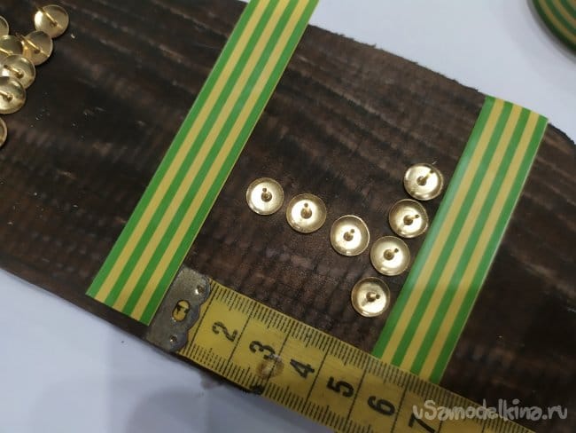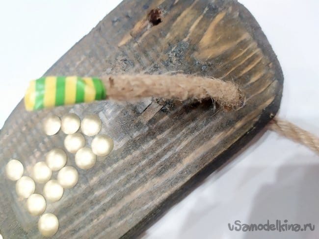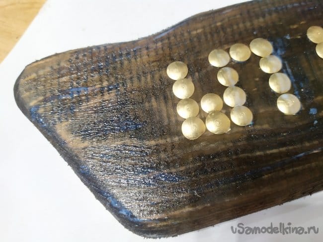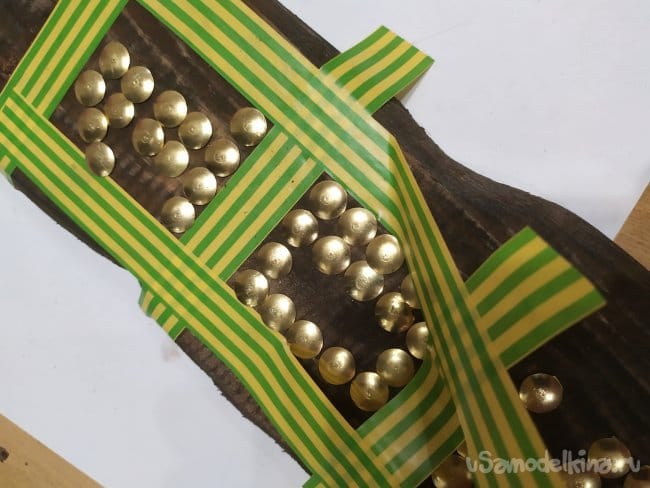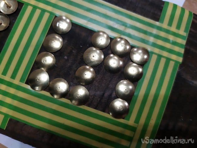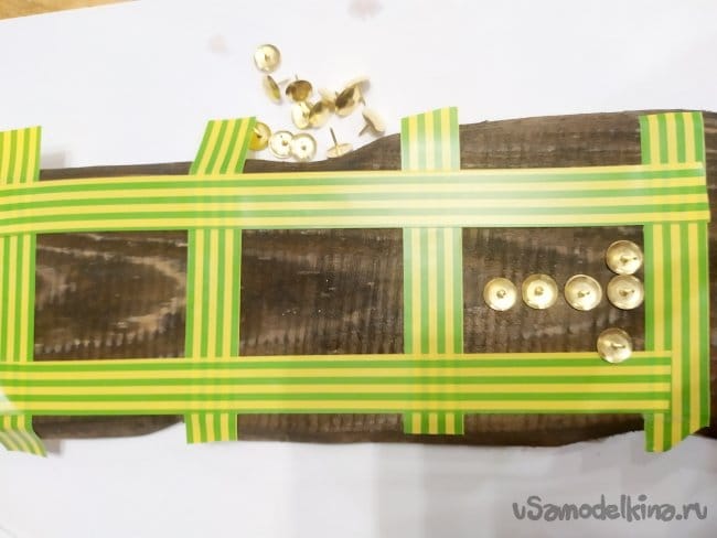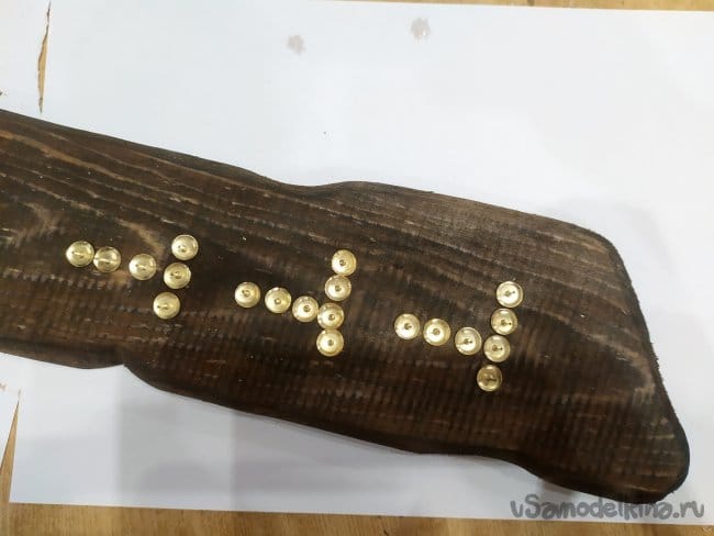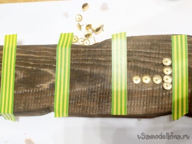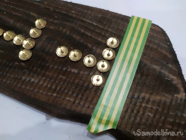 Если кнопки плохо входят в дерево, то можно немного подбить молотком. Но лучше сильно не усердствовать, молоток может оставить некрасивые следы на шляпках.