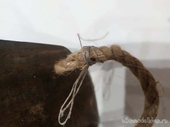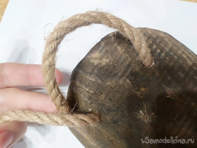 Теперь, по желанию можно вдеть веревку. Если вы переживаете, что у вас ее снимут недобросовестные товарищи, то лучше понадежнее прикрутить непосредственно к стене. У меня такая проблема не стоит, так как висеть будет в закрытом тамбуре.