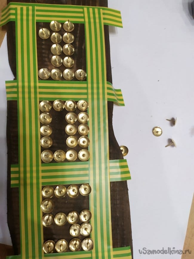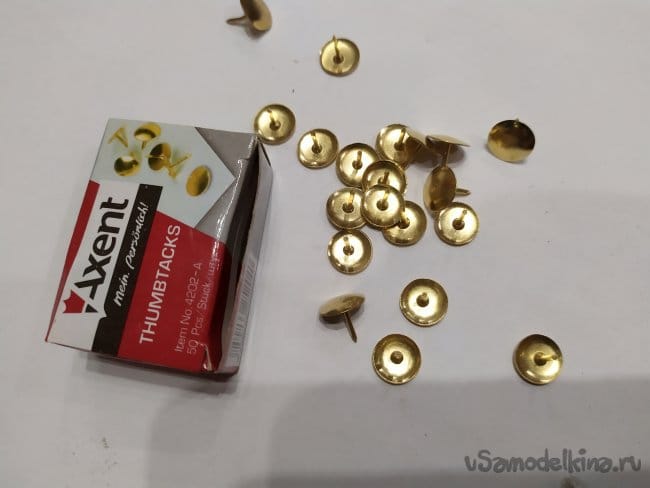 Теперь можно сделать циферки. Для них я приобрела канцелярские кнопки золотого цвета. Они очень дешевые, в районе 15р. за пачку.