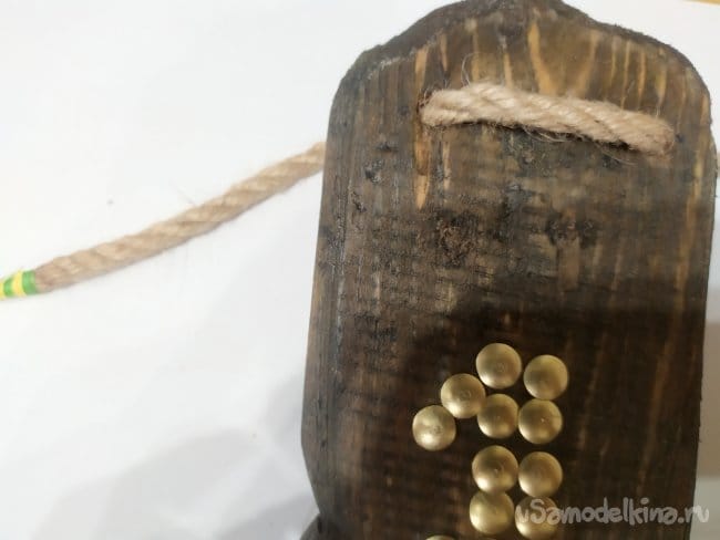 Когда морилка высохла, я решила что на стену прикреплю с помощью веревки. До этого, я рассматривала вариант прикрепления к самой стене с помощью саморезов, это убережет табличку от хулиганов. Но потом захотелось добавить веревку, поэтому, понадобится сделать два отверстия вверху. Желательно, этот шаг было бы делать до покраски.