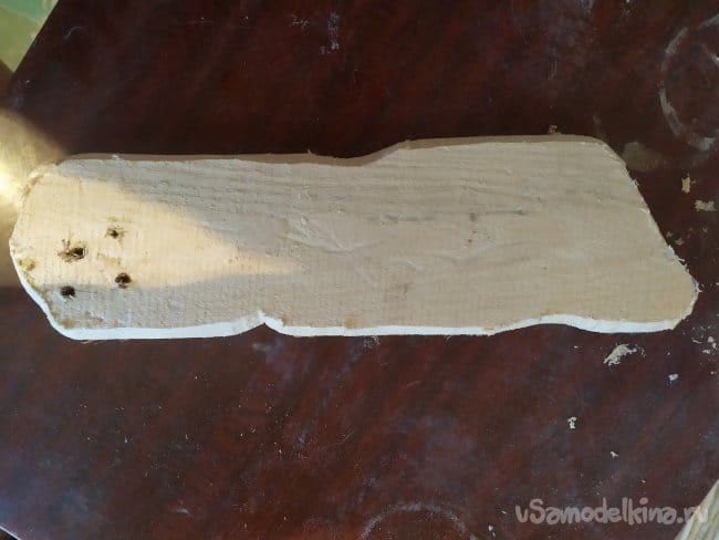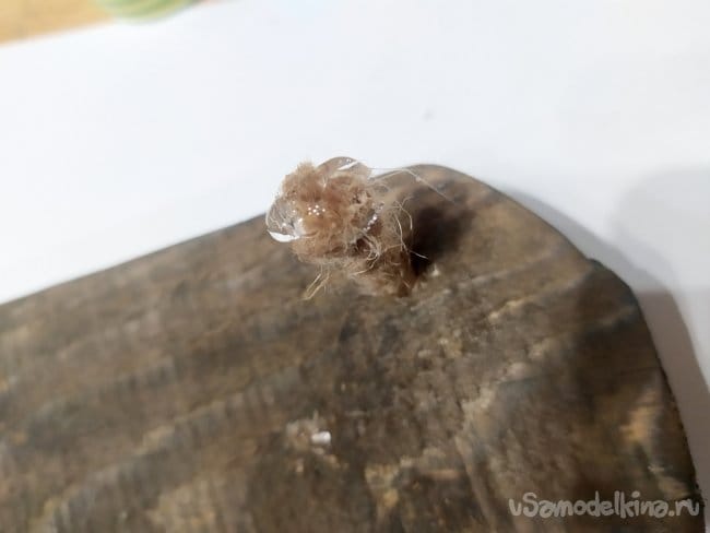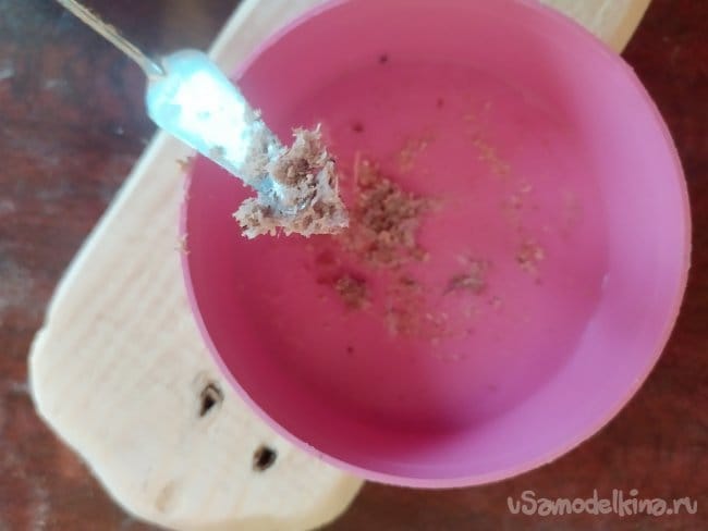 Так как на моей доске имеются недостатки, в виде отверстий от гвоздей, то их нужно замазать. Для этого я смешала стружку от дерева с клеем пва.