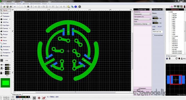 В Sprint-Layout был разработан эскиз печатной платы. Охлаждение светодиодов обеспечивают большие дуги по периметру платы, так как плата, на которой должна собираться схема, сделана из стеклотекстолита.