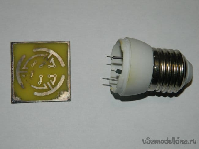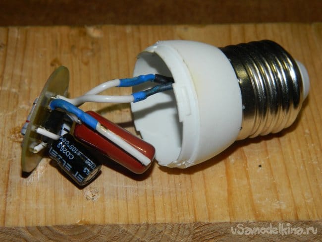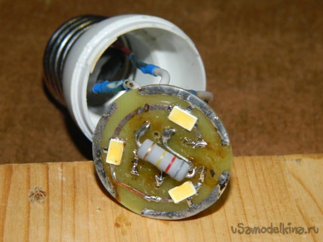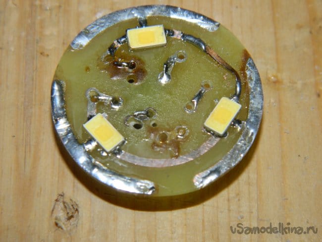 Далее на плату были напаяны радиодетали, которые благополучно разместились в цоколе лампы. Не поместился только R3, который был напаян сверху (между светодиодами).