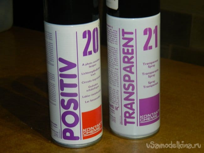 Вырезал квадратную плату (с запасом). Тонкой шкуркой с моющим средством Сиф обработал её и нанёс Positiv 20 (светочувствительный слой). Чтобы сэкономить время, выдержал в духовке при температуре 100 градусов 40 мин. (так плата сушится в тёмном месте порядка суток). Затем опрыскал кальку с рисунком Transparent 21, который позволяет делать прозрачными не только кальку, но и бумагу (очень удобно печатать с журналов), и поставил в установку для засветки.