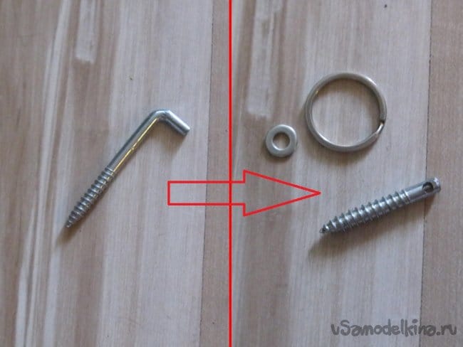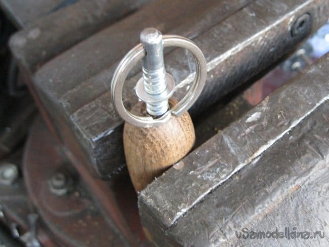 Чтобы потом вешать щётку на крючок, из винтика М6, точнее — его кусочка без резьбы, сделал вот такой стопор. А снаружи, через шайбу, вставил колечко от ключей.