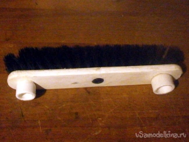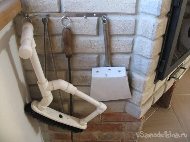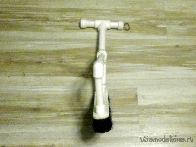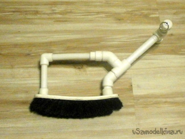 Ручка. Учитывая, что щёткой будет подметаться не только дно камина, но и стенки, с ручкой пришлось заморочиться. Поэтому если у вас возникнет впечатление, что она очень громоздкая и неудобная, спешу расстроить: использование показало, что это не так. А сделал её из обрезков пластиковых труб полдюйма и три четверти: просто были под рукой.