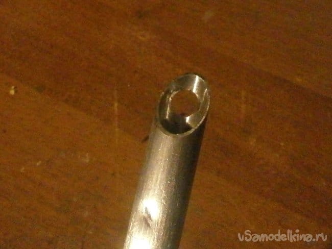 Но как показала первая примерка, она — чересчур короткая. Поэтому не оставалось ничего, кроме как её удлинить. Сначала была мысль надставить трубку, нарезав в ней резьбу снаружи, а на штоке — наружную (был подобный опыт), а потом попалась на глаза ручка для напильника.