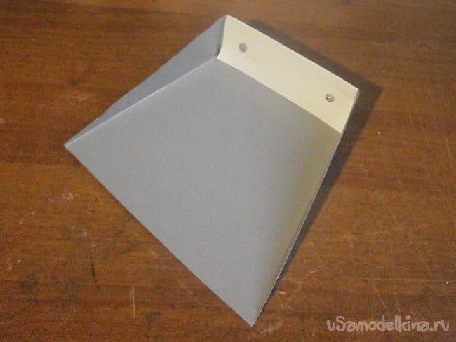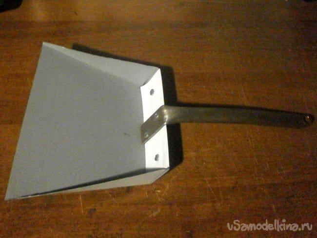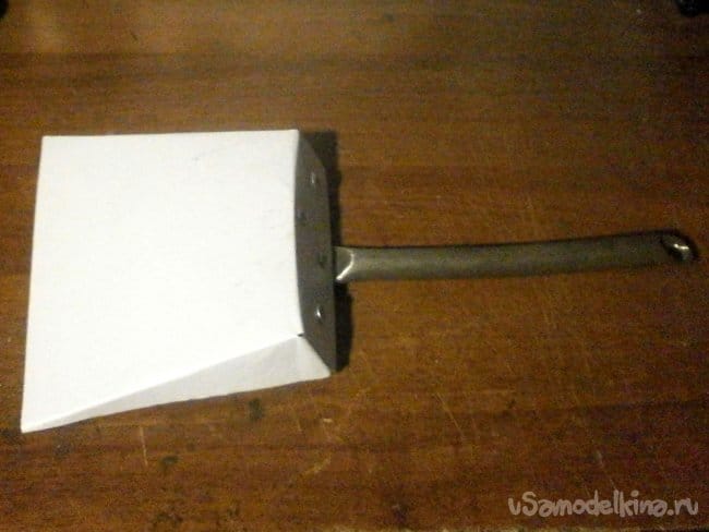 А ручку, учитывая получившиеся размеры совка, решил сделать из кусочка алюминиевой трубки: он был под рукой. Наискосок срезал один край, просверлил отверстие: так он будет вешаться.