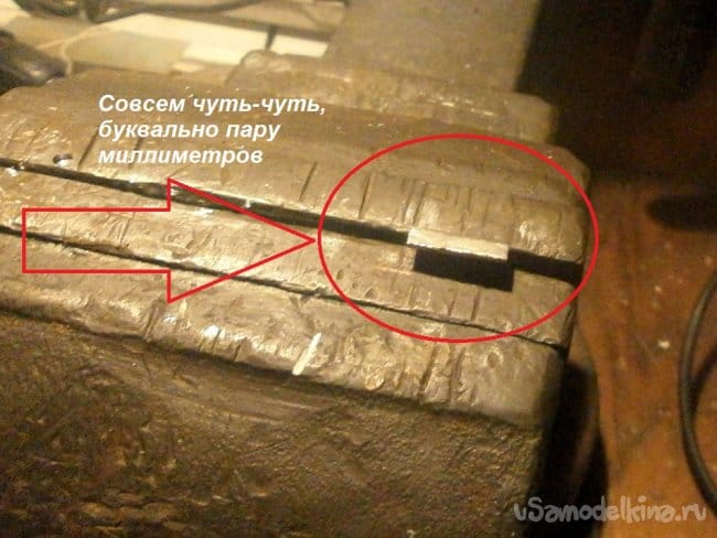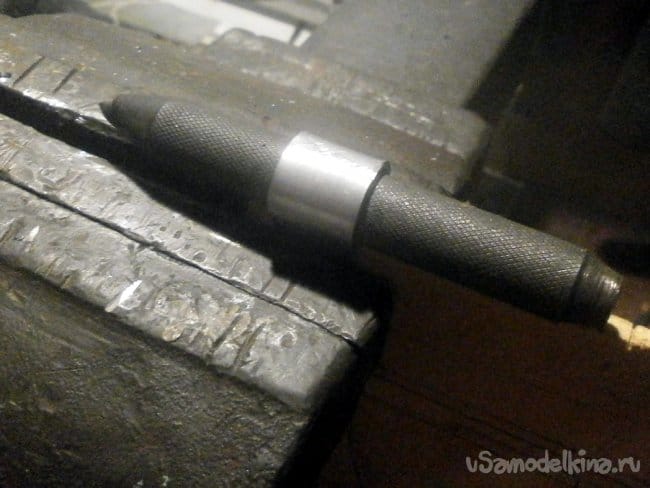 а потом — и посредине. А чтобы получилось колечко и половинки не прилегали одна к одной, проложил толстый керн и кусочек фанеры-четвёрки, когда зажимал конструкцию в тисках.