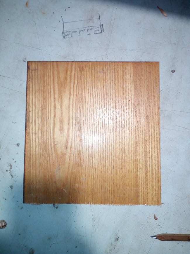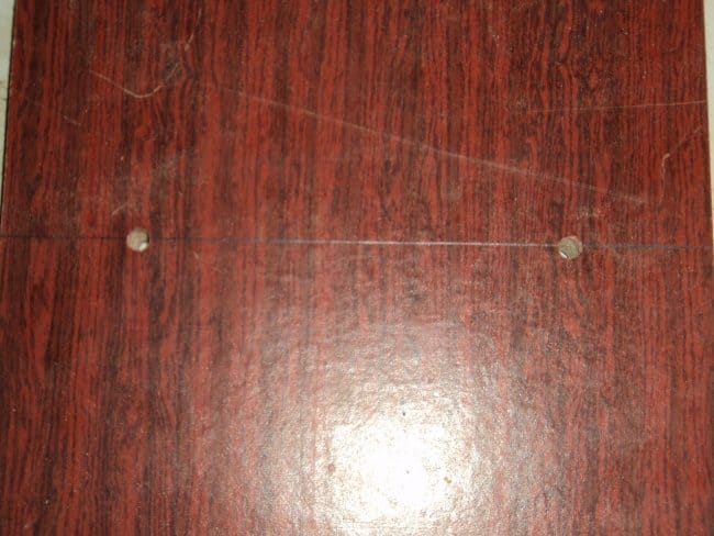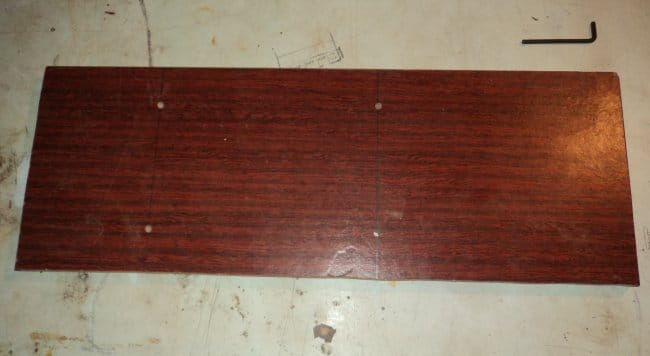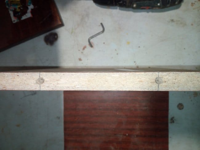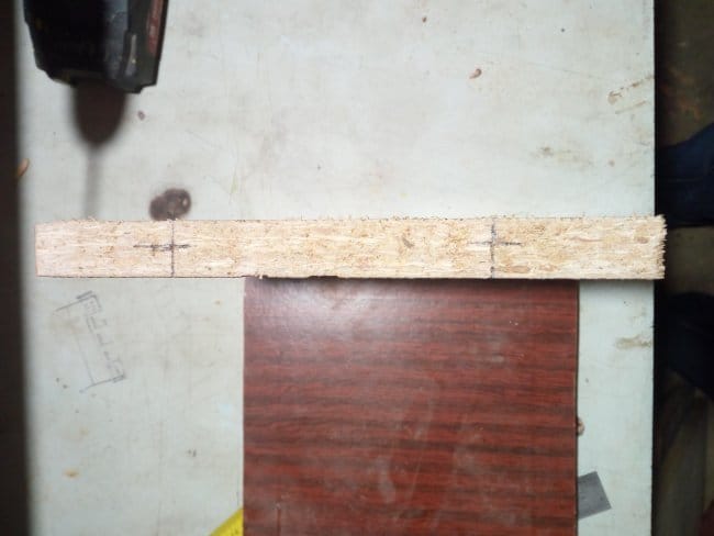 Материалом для изготовления данного инструментального органайзера, если такое понятие применимо к полке, послужили плиты ДСП от старой советской стенки, которые у меня лежали уже достаточно долго. Их то я и пустил в дело. Сделав на плите разметку необходимых мне размеров деталей я их отпилил. У меня вышло 4 заготовки. 2 боковые части и 2 поперечные. Так как я предварительно нарисовал то, что хочу получить в конечном итоге, то сразу же приступил к сверлению крепежных отверстий под евросаморез. Для этого мне понадобились шуруповерт и сверло диаметром 5 мм. Отверстия я делал на расстоянии 5 см от краев детали на плоскости поперечной заготовки, на которой впоследствии будут лежать инструменты и на боковых частях стенок. Приступаю к сборке имеющихся деталей.