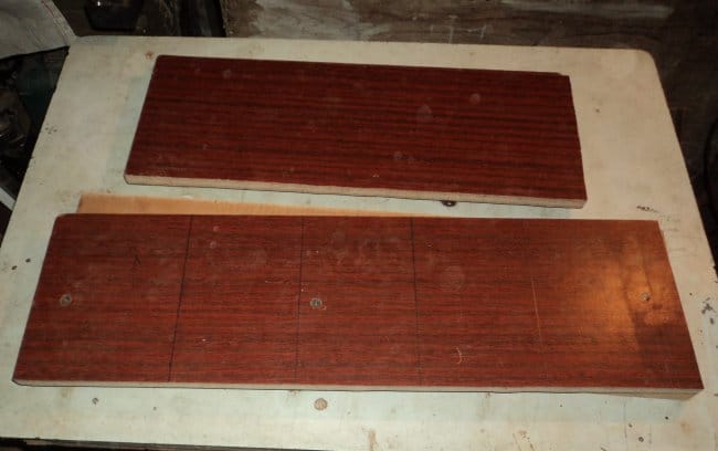 Далее я выпиливаю 4 заготовки, которые играют роль боковых разделяющих частей между посадочными местами инструментов. В их торцевых частях так же делаю отверстия под саморезы, которыми они будут крепиться к нижней части поперечной плоскости полки. Стягиваю все эти детали саморезами. А вот тут меня поджидал вполне предсказуемый, но все равно достаточно неприятный сюрприз - все поперечные детали прикрепленные к полке стояли вкривь и вкось. Дело тут в нескольких факторах. Во-первых, я поленился использовать циркулярную пилу, подумав что для таких небольших деталей будет вполне достаточно отпилить их лобзиком. Но как ни старался пилить строго по разметке, все равно пилка уходила кое-где в стороны, так что с рез соответственно получился не достаточно ровным. Во-вторых, и я склонен это считать самым определяющим фактором в этом «косяке», это то, что отверстия я сверлил без использования каких-либо кондукторов или сверлильного станка. Их у меня попросту нет. Отверстия делались вручную «на глазок». Поэтому в конечном итоге все и привело к столь плачевному результату. При изготовлении подобного не повторите моих ошибок.