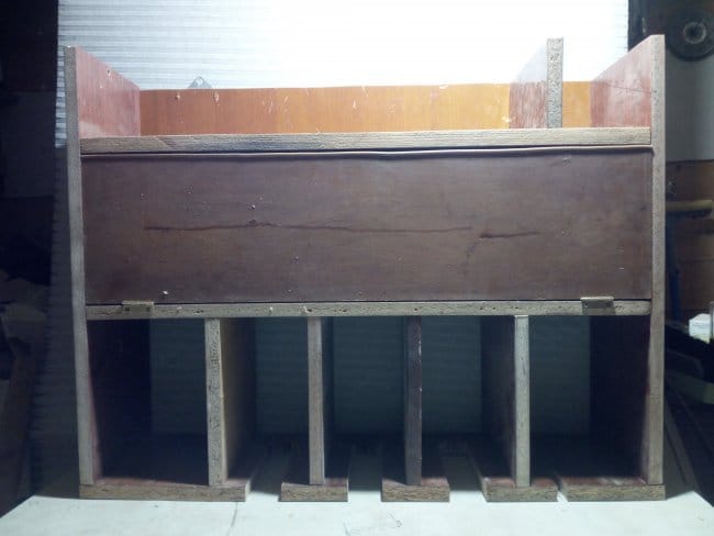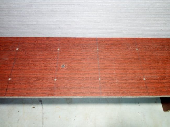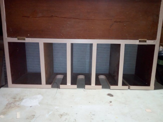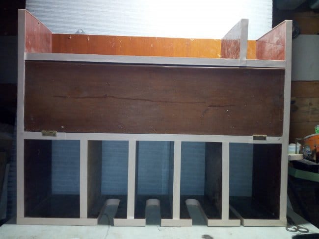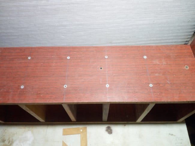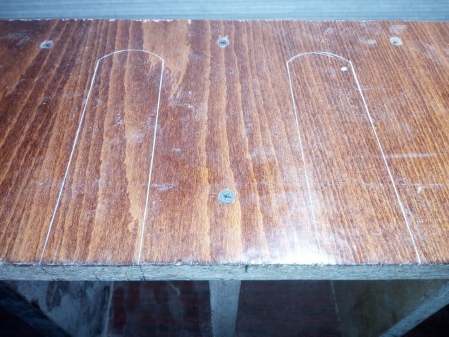Как уже говорилось выше, дна у этого сооружения не планировалось вовсе. Там я планировал сделать перевернутые вверх ногами Т-образные полочки. Но так как все получилось не так, пришлось делать немного по иному. Но в конечном итоге результат меня порадовал. Перевернув конструкцию вверх дном, я произвел разметку и выпилил по ней овальные выемки. Они нужны для того, чтобы в них вставлять шуруповерты.