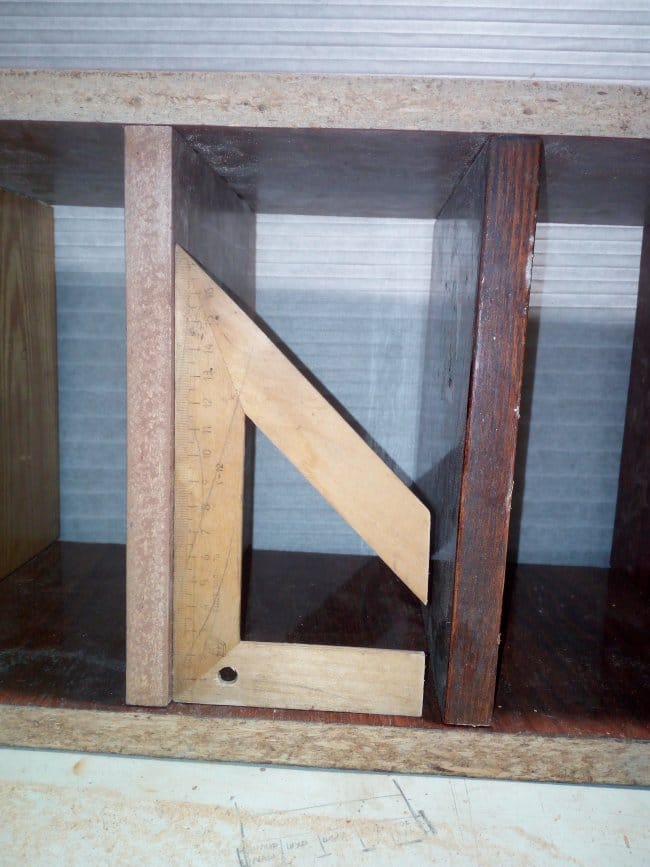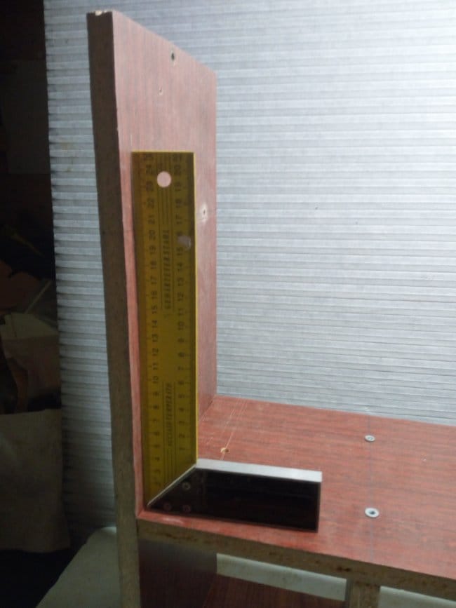 Пришлось делать еще одну заготовку уже под эти части. Ослабив крепления у перпендикулярных частей полки и прикрутив заготовку уже к нижним частям,я все таки добился того, что все части стали ровно стоять, без перекосов. Дно полки к этим деталям я крепил саморезами по дереву.