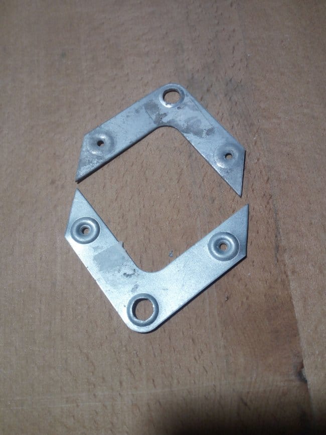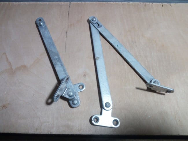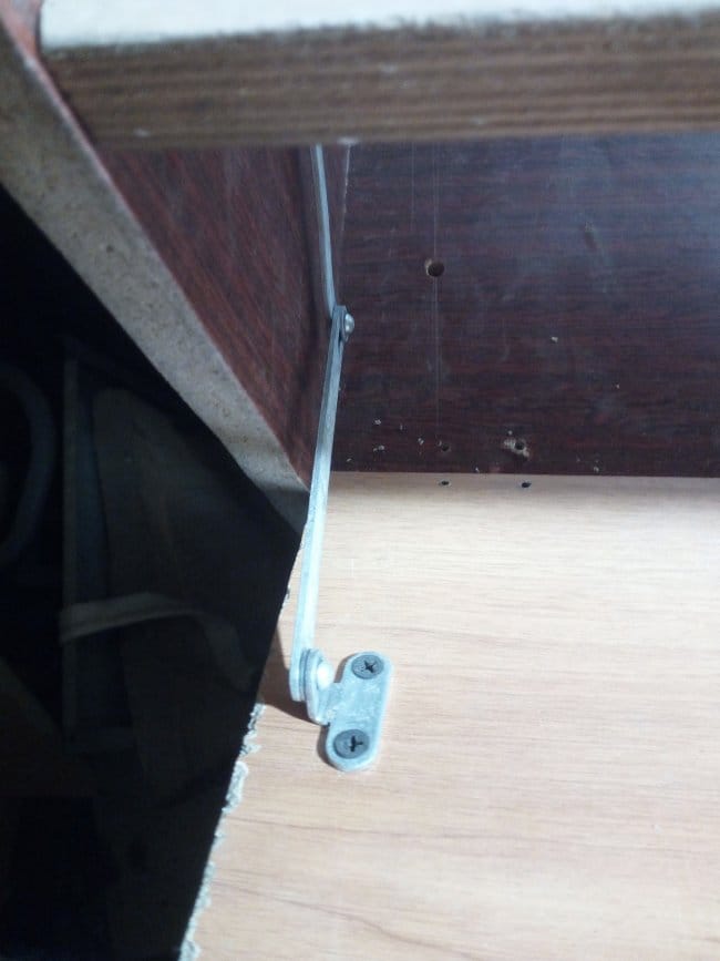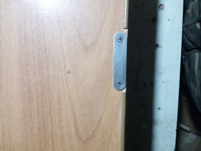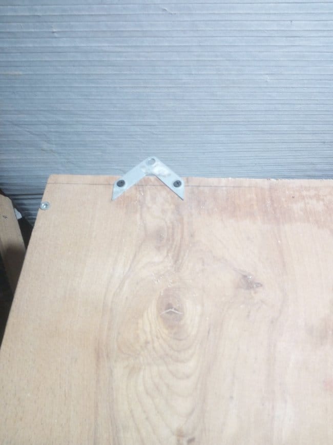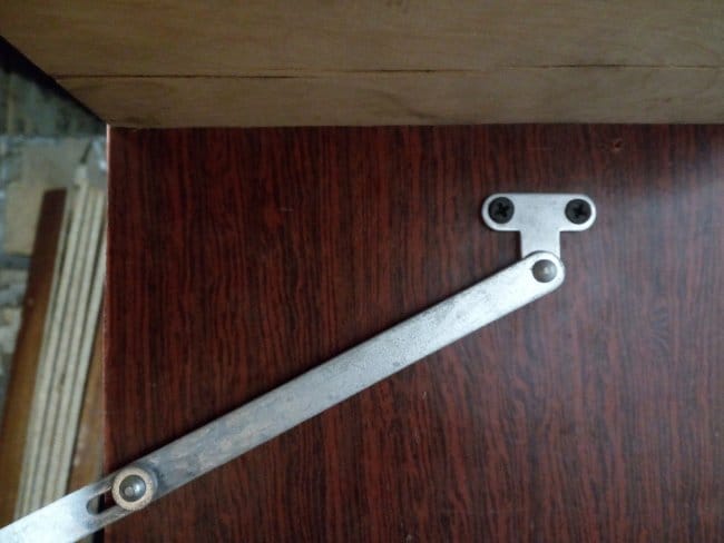 Петли я использовал маленькие навесные, приобретенные мною в магазине мебельной фурнитуры, как и все другое использованное при изготовлении этого полочного органайзера. На верхнюю часть дверки я нанес немного Момента и надел на нее гибкий п-образный кант с обхватом боковин. Через небольшой промежуток времени, достаточный для схватывания клея, установил на дверь петли и повесил ее на полку. Прикручивал небольшими саморезами. При открывании дверь полностью откидывалась и ложилась на нижний этаж, закрывая доступ к инструментам. Поэтому во избежании полного откидывания дверки я установил ограничители хода. Их я снял со старого серванта, которых тоже в разобранном виде лежит у меня в сарае. Далее ставлю магнит и металлическую планку чтобы дверь более плотно закрывалась и не могла самостоятельно открыться. Для крепления полки к стене использую уголки. Они достаточно крепкие и вполне выдержат и вес самой конструкции и и вес при полной её загрузке.