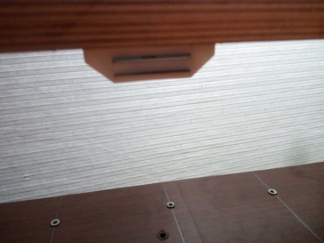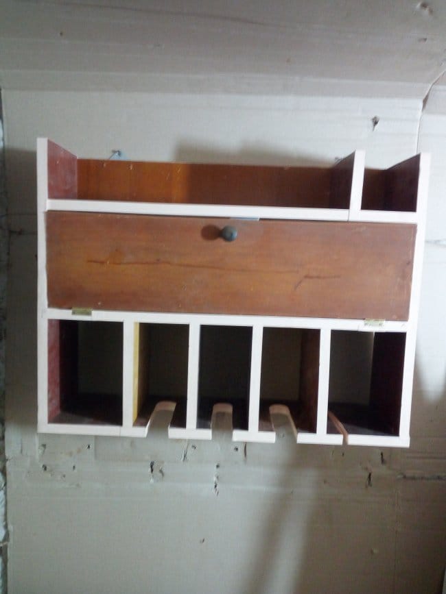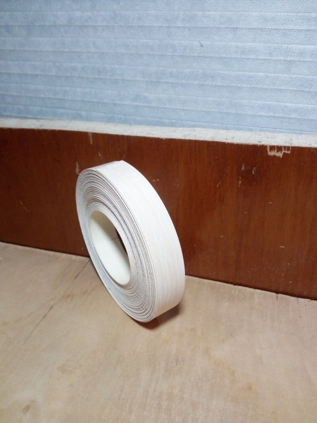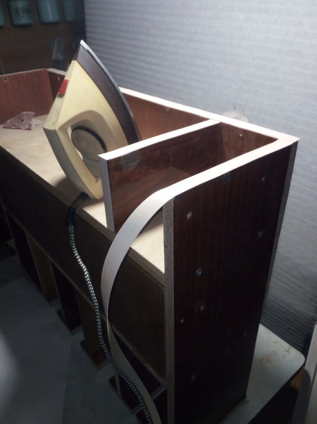 Полка практически готова. Но чтобы она выглядела более презентабельно и интересно, лицевую часть, где видны спилы, я решил задекорировать кромочной лентой с нанесенным на ее изнаночную сторону клеевым составом. Для этого я взял старый, но рабочий утюг, дождался пока он хорошенько прогреется и приступил к работе. Отмерив нужной длины ленту, я прикладывал ее к кромке полки и через бумажный лист А4 проглаживал утюгом. При нагревании клей плавился и намертво приклеивал ленту к полке. Лист я использовал потому, что задевая лак нанесенный на ДСП, горячий утюг его плавил. Да и пачкался сам. А так в тех местах где можно было не бояться зацепить подошвой утюга лаковое покрытие, я прогревал ленту без него. Так даже удобнее. Лента не портилась и не плавилась. Изрядно пришлось повозиться при проклеивании выемок под шуруповерты, особенно закругленные их части. А про прорезь под пилку электролобзика так вообще говорить не хочется. Но все таки все было оклеено. На дверцу установлена ручка, а сама полка была повешена на стену!