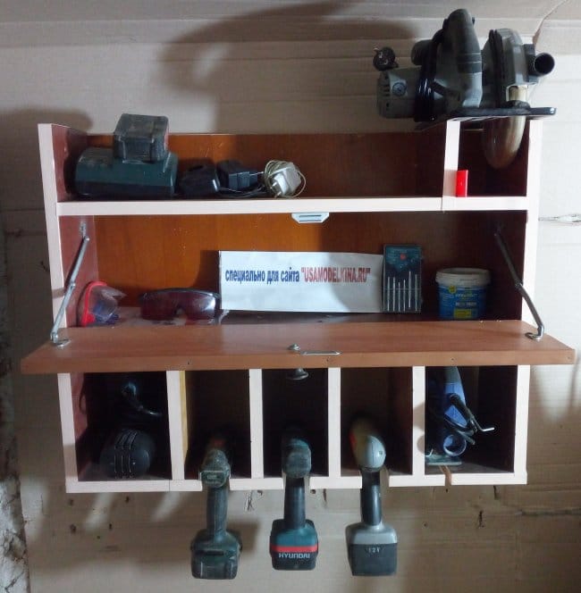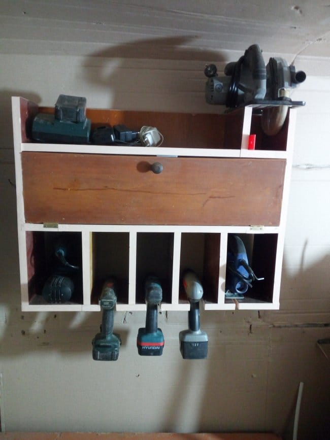 Вот что получилось в конечно итоге. 2 потраченных вечера и полка для инструмента готова. На ней удобно размещаются шуруповерты, лобзик, имеется отсек для еще одного небольшого инструмента, в данном случае это орбитальная шлифмашина, подставка и место для мини циркулярной пилы ну и конечно же отсек с дверцей, куда буду складывать разнообразную мелочевку. Результатом я доволен. При минимальных размерах комнат в мастерской, таким методом я разложу по местам весь необходимый в работе инструмент.