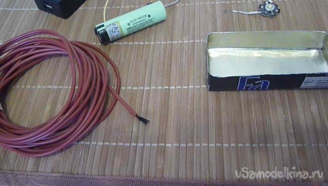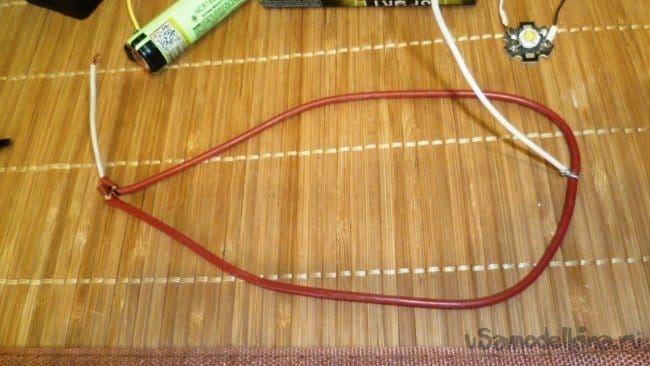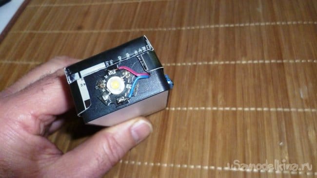 Распаиваем схему устройства. У меня аккумулятор был уже с контактными пластинами -это упростило сборку. Провода цепи нагревателя припаял непосредственно к аккумулятору. Светодиод для фонаря приклеиваем к торцу корпуса. В цепи светодиода стоит диод 1N4007 (можно использовать любой с током до 1 А), он предназначен для снижения напряжения с 4В до 3 В, чтобы светодиод преждевременно не вышел из строя.